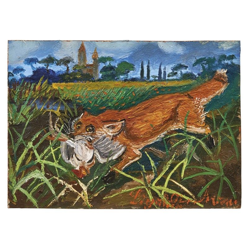 Nell’opera Volpe in fuga, possiamo osservare uno dei soggetti più amati da Ligabue: la volpe che è in fuga tra la pianura e i boschi con la sua preda tra le fauci, il predatore ancora una volta ha vinto sulla vittima. È un’opera che rappresenta a pieno il fantastico e coinvolgente mondo dell’artista, una scenografia magistralmente eseguita, una raffinata tavoletta dalla grande qualità tecnica proveniente da un’importante collezione privata.