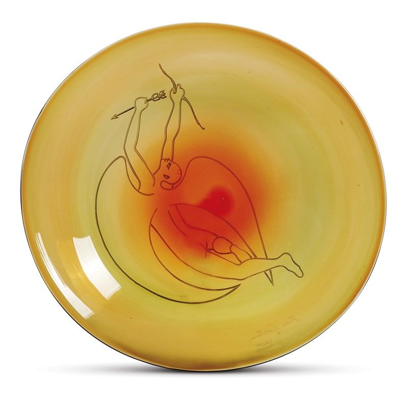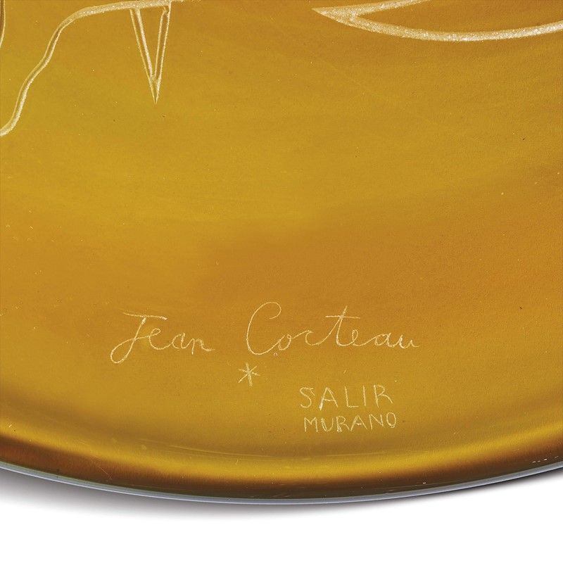 Cocteau non ha solo ispirato tra le più belle opere di Costantini ma è stato anche colui che ha dato il nome al movimento fondato da Egidio. L'artista conosce Costantini nel 1954: la loro collaborazione è il frutto dell’incontro di due differenti sensibilità artistiche tra loro complementari. Il percorso artistico iniziato assieme li porta ad affrontare temi fra loro differenti. Primo tra questi è la volontà di introdurre la nozione dell’arte nell’ordinario e nel quotidiano, ma di focale importanza per i due è anche la mitologia, quella che lo stesso Cocteau ha sviluppato prima attraverso i suoi sogni e poi attraverso le sue immagini. Chiaro esempio ne è il piatto ivi presentato, realizzato su disegno del maestro francese, in vetro soffiato di Murano, dai colori sfumati ambra, marrone, rosso e inciso un angelo, inevitabile riferimento fiabesco ma anche allusione al nome del movimento creato dall'amico Egidio. Il sodalizio trai due continua per alcuni anni, fino alla morte dell'artista, ed è caratterizzato da profonda stima reciproca, difatto, come afferma lo stesso Cocteau nel 1958 "Quando la decadenza attira verso il basso un'aristocrazia artigianale e accetta di rispondere alle esigenze della volgarizzazione, non è degno d'ammirazione vedere gli artisti rifiutare questo patto col diavolo e glorificarsi, a qualsiasi prezzo, nel servire gli angeli? È lo stile della Fucina degli Angeli, dove Murano cerca di fuggire alle cattive abitudini percorrendo nuove strade. Egidio Costantini pensa con il cuore ed è con il soffio della fucina del cuore che prolunga le audacie trasparenze e ricche di grazia di Venezia."