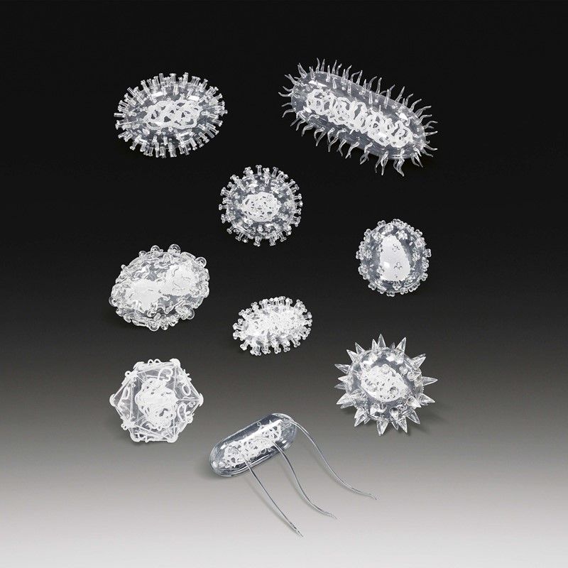 Tra i molteplici lavori la serie Glass Microbiology si ispira alla microbiologia riproducendo i virus del passato, del presente e anche del futuro tutte rigorosamente in vetro.