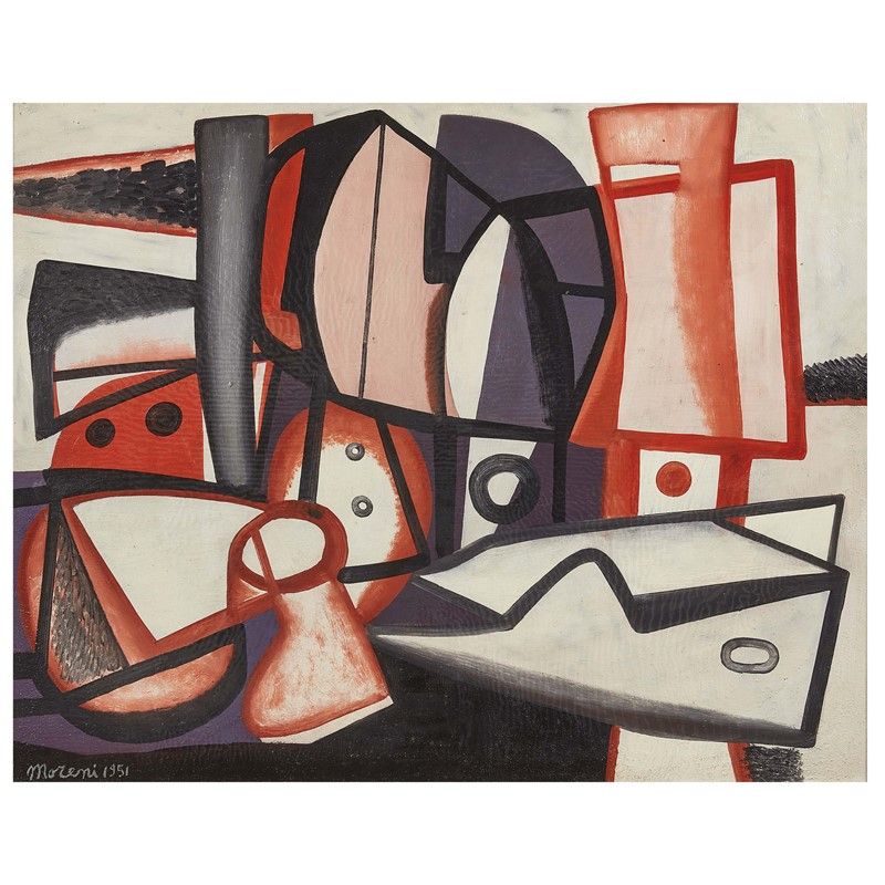 Sono gli anni del post cubismo, Mattia Moreni compone immagini totalizzanti, dal controllo intellettivo e compositivo, in cui, di volta in volta, il colore e il lirismo si esaltano vicendevolmente, i fondi hanno una tonalità neutra e le forme geometriche vengono esaltate dai contorni predefiniti e marcati. La struttura compositiva delle opere viene proposta secondo le varianti dello sviluppo verticale e/o orizzontale, con molte analogie nella definizione degli elementi plastici, sviluppando diverse gamme cromatiche, a volte con accenti squillanti altre in modo più delicato, rivelando però l’utilizzo di certi cangiantisi del tutto inconsueti nella pittura coeva.