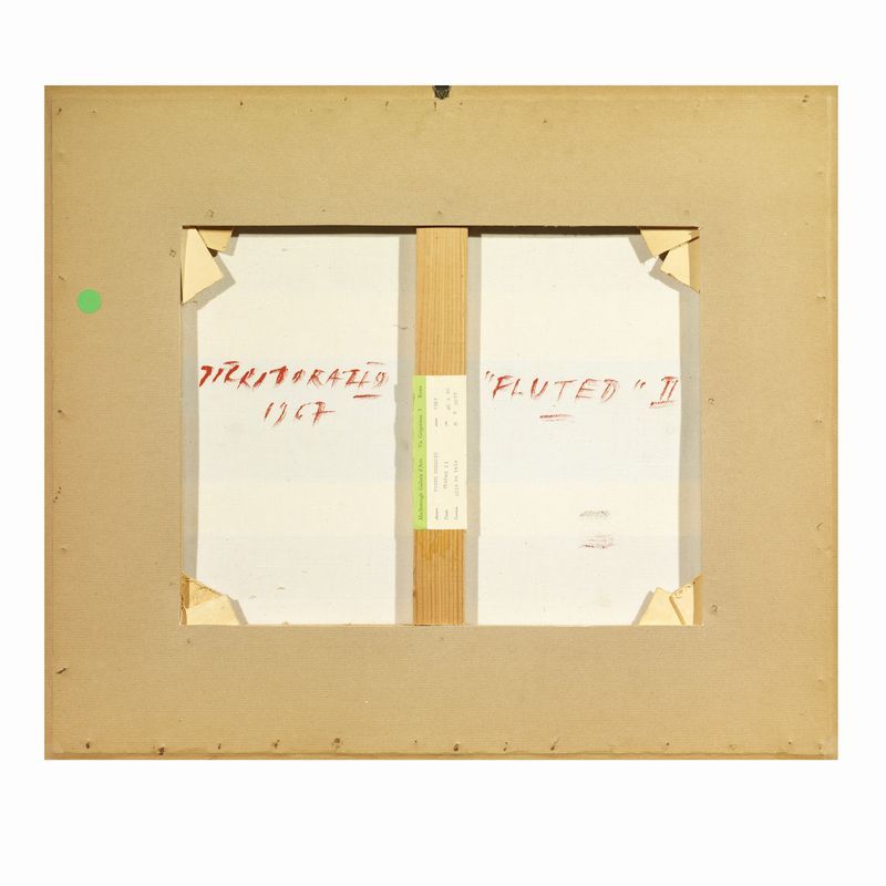 Nell’opera qua presentata, Fluted II, del 1969 ed esposta alla Malborough di Roma, Dorazio muta radicalmente rispetto all’arte dei primi anni 60, anticipando di poco quella che sarà la caratteristica del decennio seguente: le bande di colore. L’artista entra in una fase che pare sintetizzare tutte le esperienze astrattive da lui fin qui affrontate. Sospesa definitivamente l’attività di insegnamento, decide di dedicarsi in pieno al suo lavoro di pittore e inizia così a dipingere tele formato orizzontale e verticale, nelle quali le bande, frantumate da zone di colore contrastanti, si muovono slittando l’una sull’altra da un angolo all’altro della tela, non in successioni regolari, ma accavallandosi in una prospettiva lontana e integrandosi a vicenda con il fondo. Anche in questa parentesi la componente cromatica è fondamentale e caratterizzata da contrasti monocromi improvvisi che interrompono l’andamento del disegno. Il colore è qua l’indiscusso protagonista.