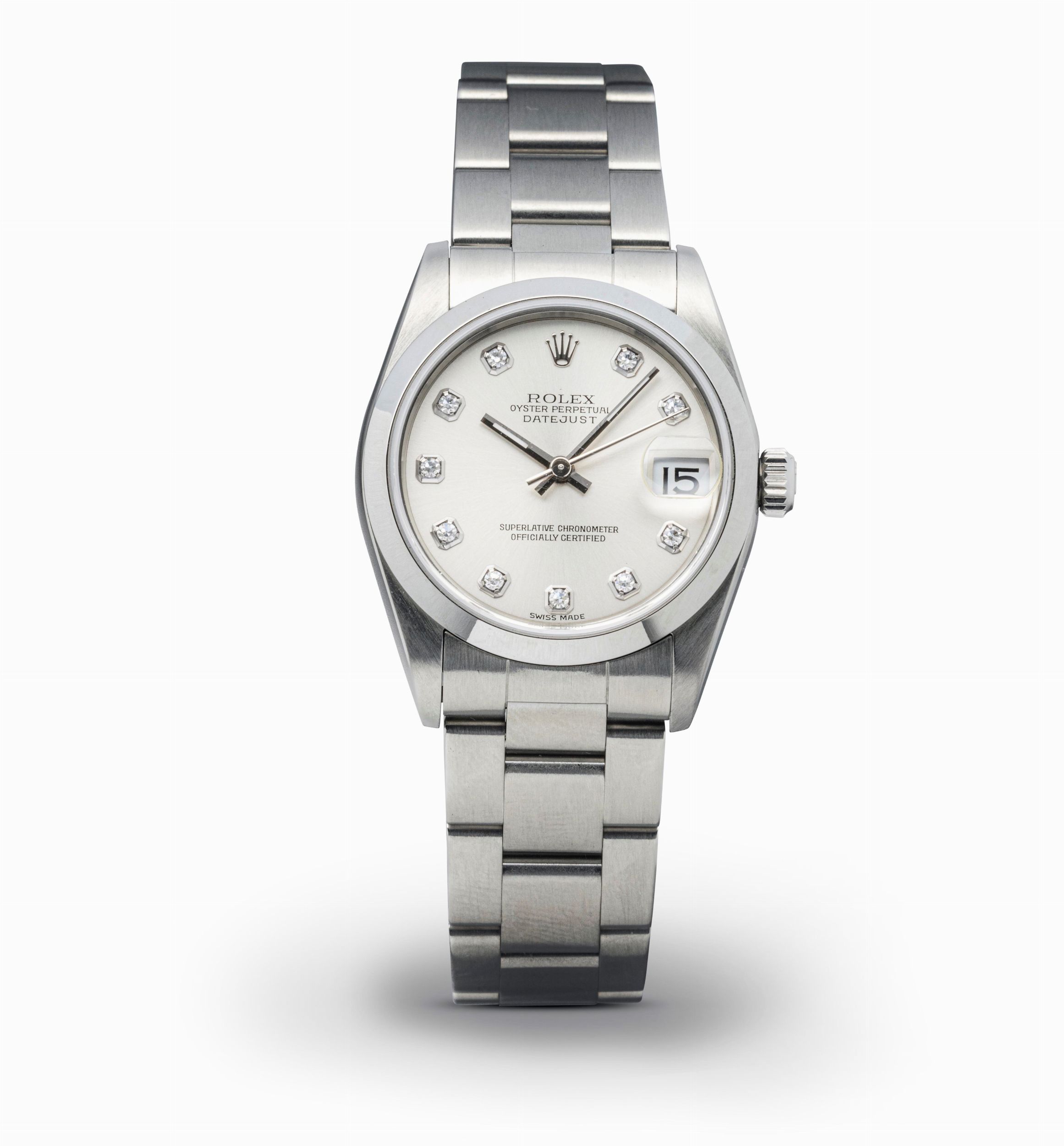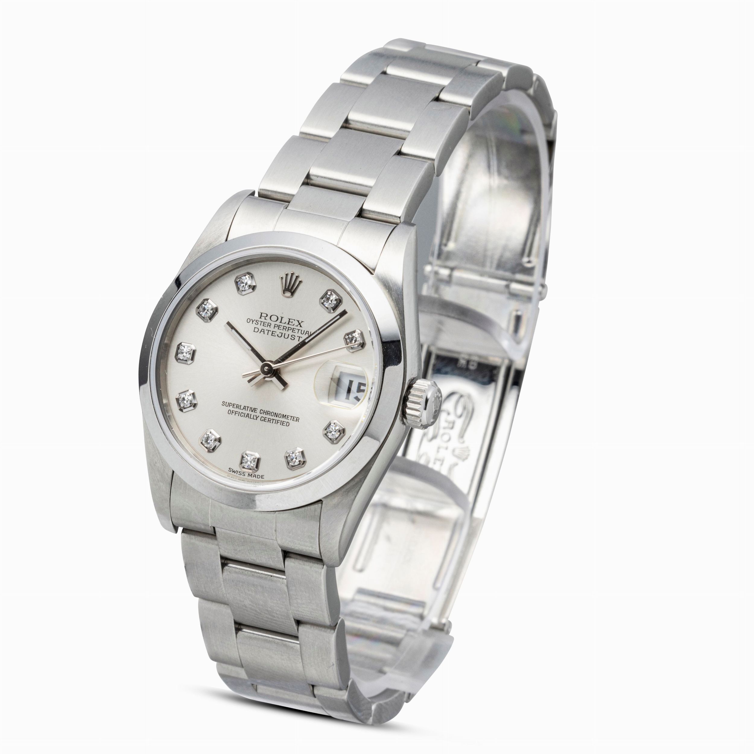 Fine ed elegante Datejust in acciaio con ghiera liscia, quadrante Argentè con indici [..]