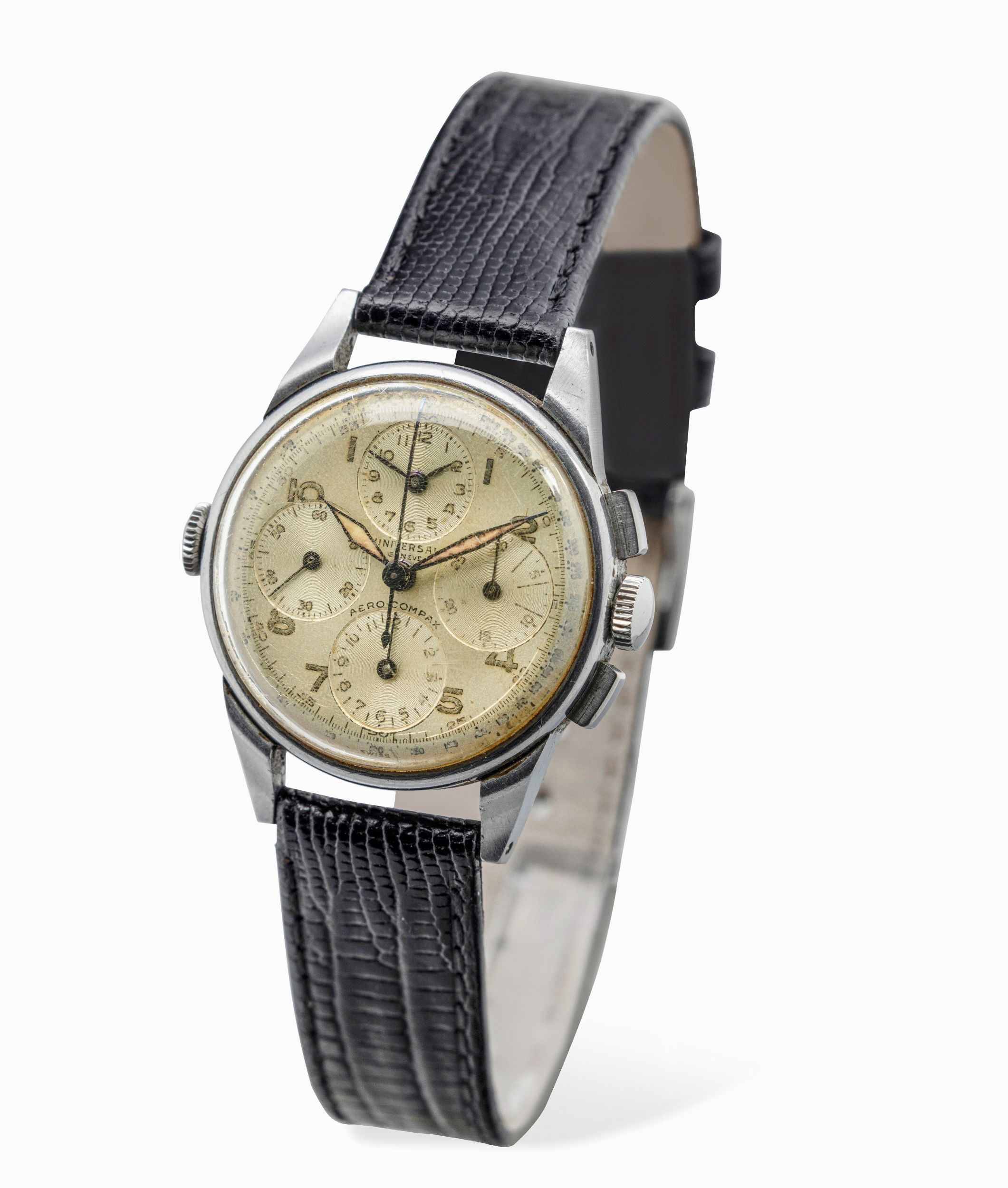 Raro orologio da pilota in acciaio, cronografo a tre contatori con memento dial, [..]