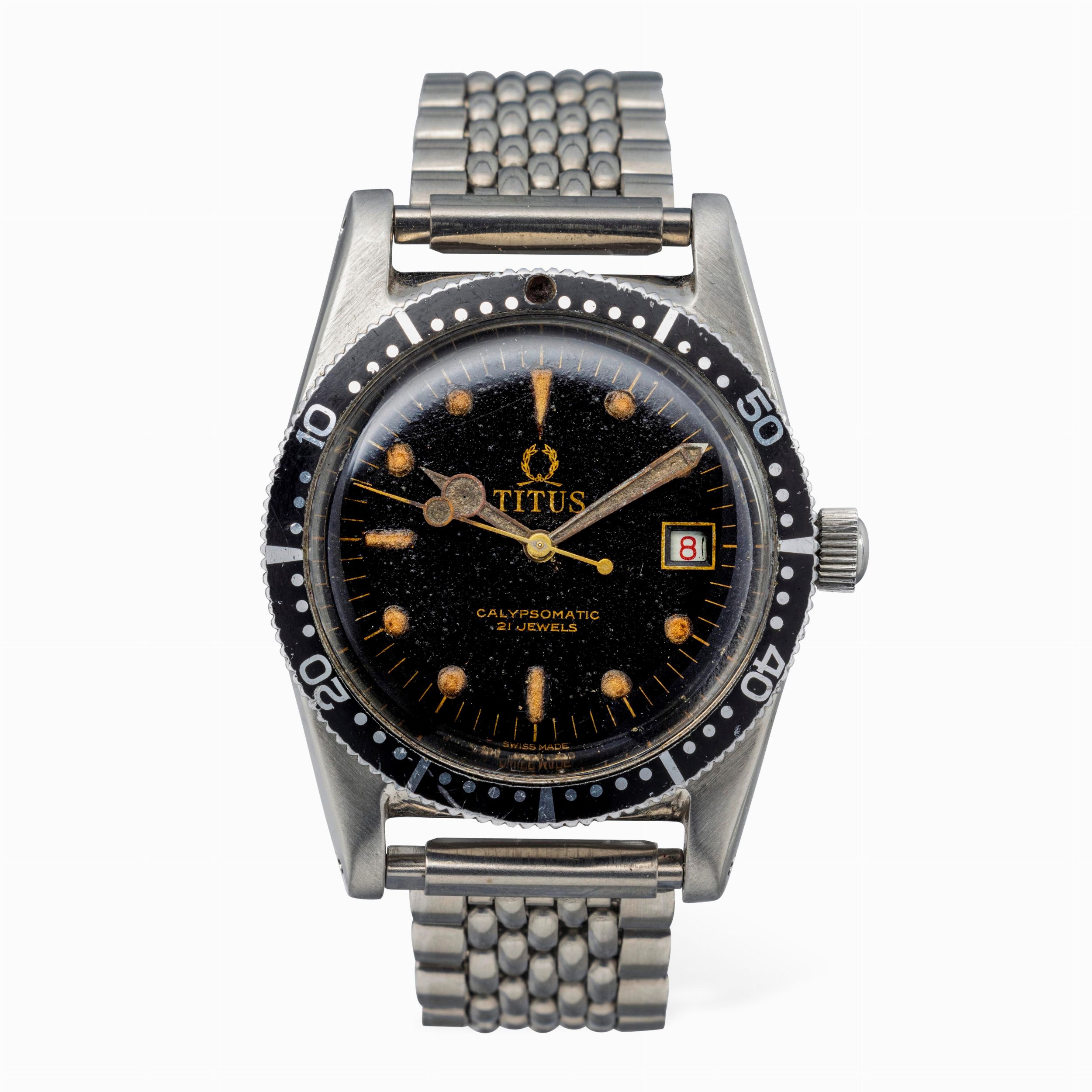 Sportivo e raro Diver Calypsomatic in acciaio con fondello a vite, quadrante nero [..]