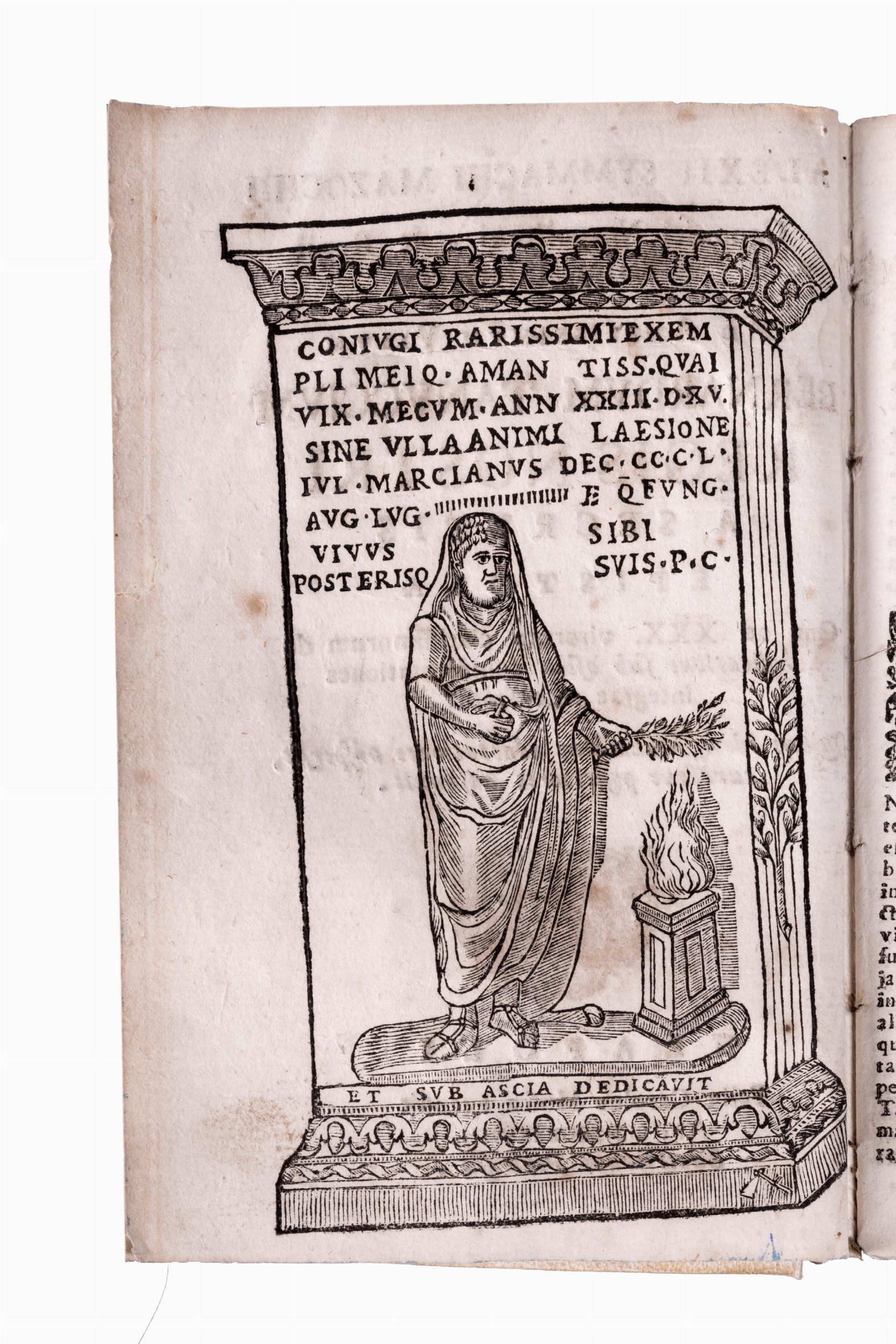 1739 Neapoli, Felix Carolus Musca, 1739. In 8°, grande incisione su rame al verso del frontespizio raffigurante un monumento sepolcrale con dedica Sub ascia, pp. 330 con numerosi esemplari di ascia in ferro, pietra e legno incisi n.t. Legatura coeva in pergamena, titolo in oro, tagli colorati.