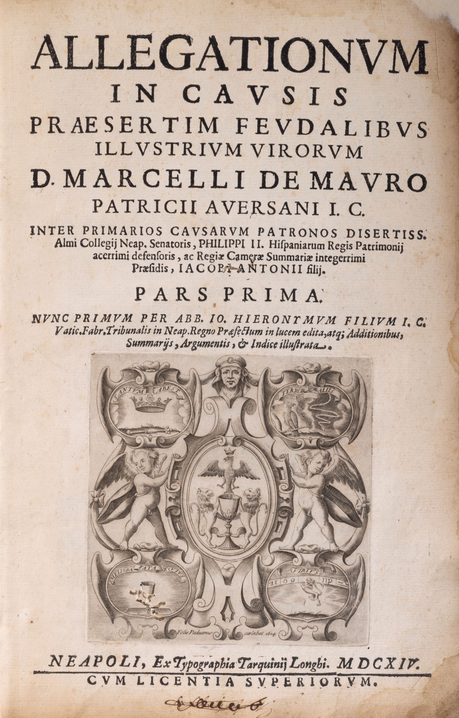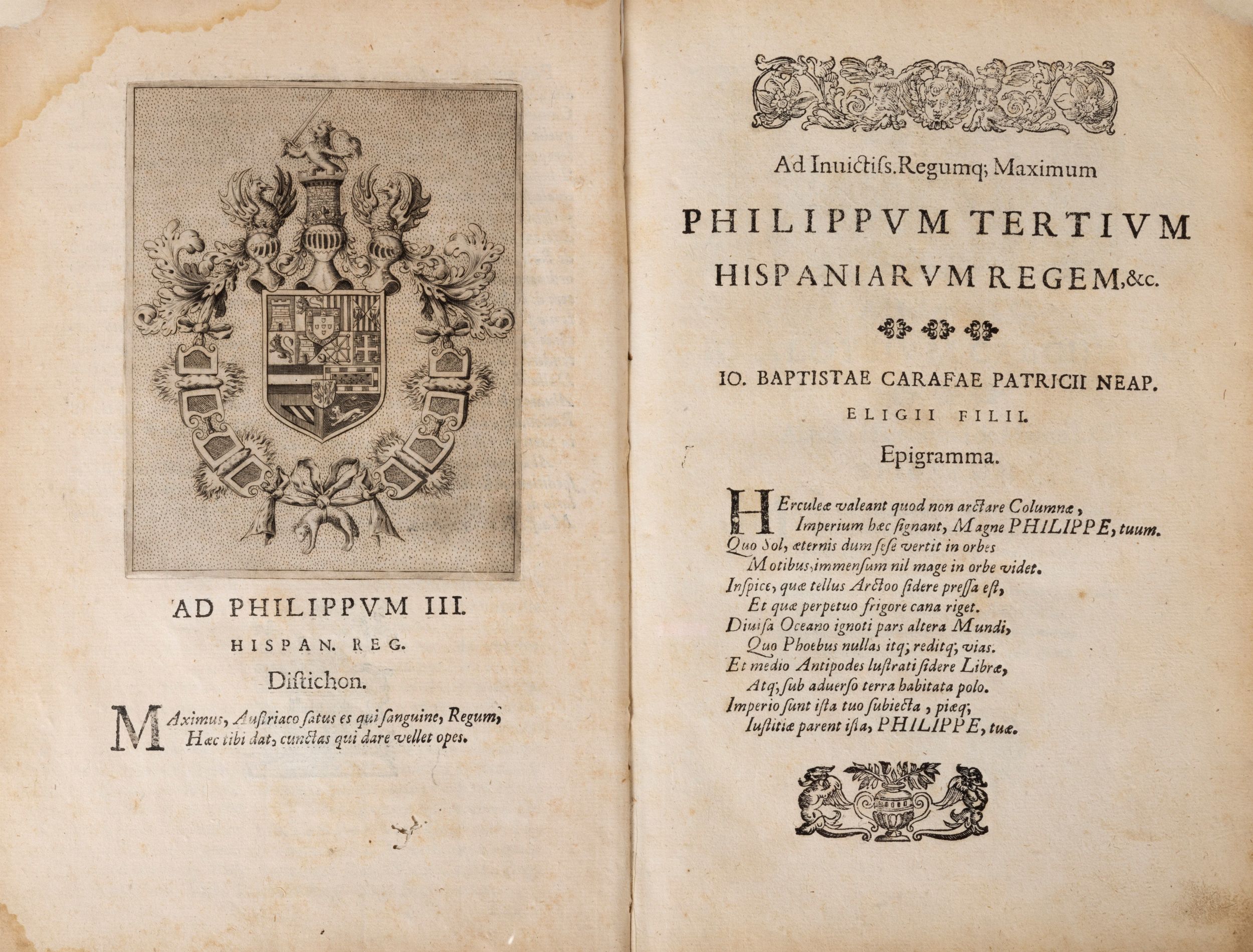 Neapoli, ex Typographia Tarquinij Longhi, 1614. In Folio, artistica vignetta incisa su rame al frontespizio da Felice Paduano, pp. (8)-310-(18). Stemma di Filippo III e grande vignetta raffigurante i due scrittori nello studio incisi su rame da Martin Van Buiten nel testo. Legatura moderna in piena pergamena, titolo calligrafico.