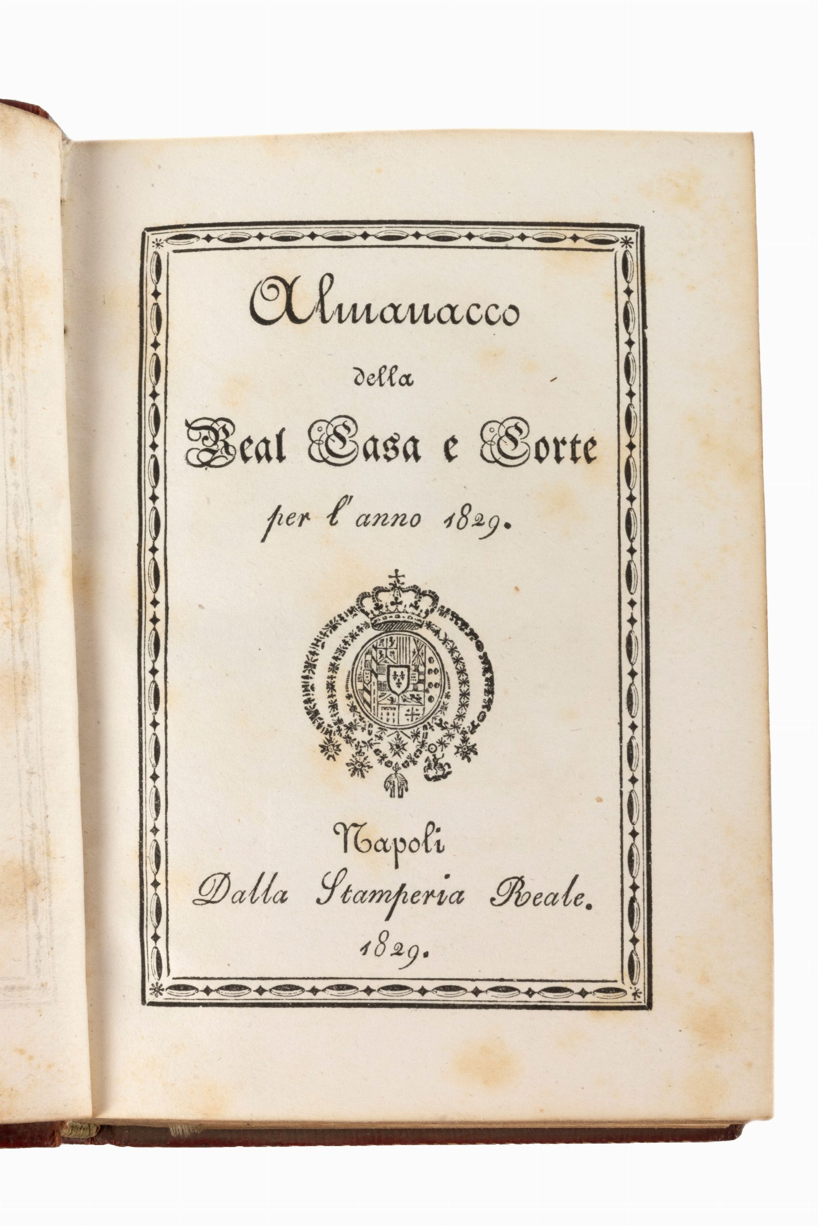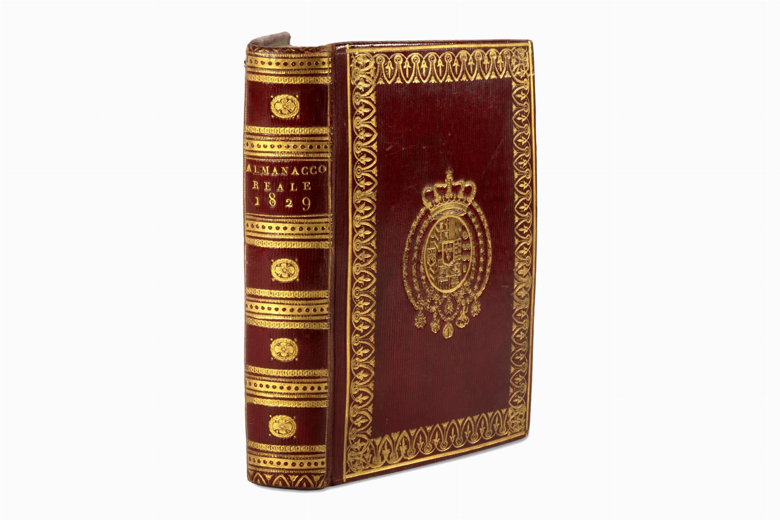 Napoli, dalla stamperia Reale, 1829. In 8°. Frontespizio inquadrato da cornice di filetto e stemma calcografico, ritratto a piena pagina di Francesco di primo, inciso in rame, calendario dell'anno, in fine volume grande tavola più volte ripiegata Carta del regno due Sicilie incisa in rame da Marco di Pietro, qualche arrossatura sparsa, legatura in marocchino rosso a grana lunga, ai piatti cornice di rotella al centro del campo grande stemma del Regno delle due Sicilie sormontata da corona, tagli dorati.