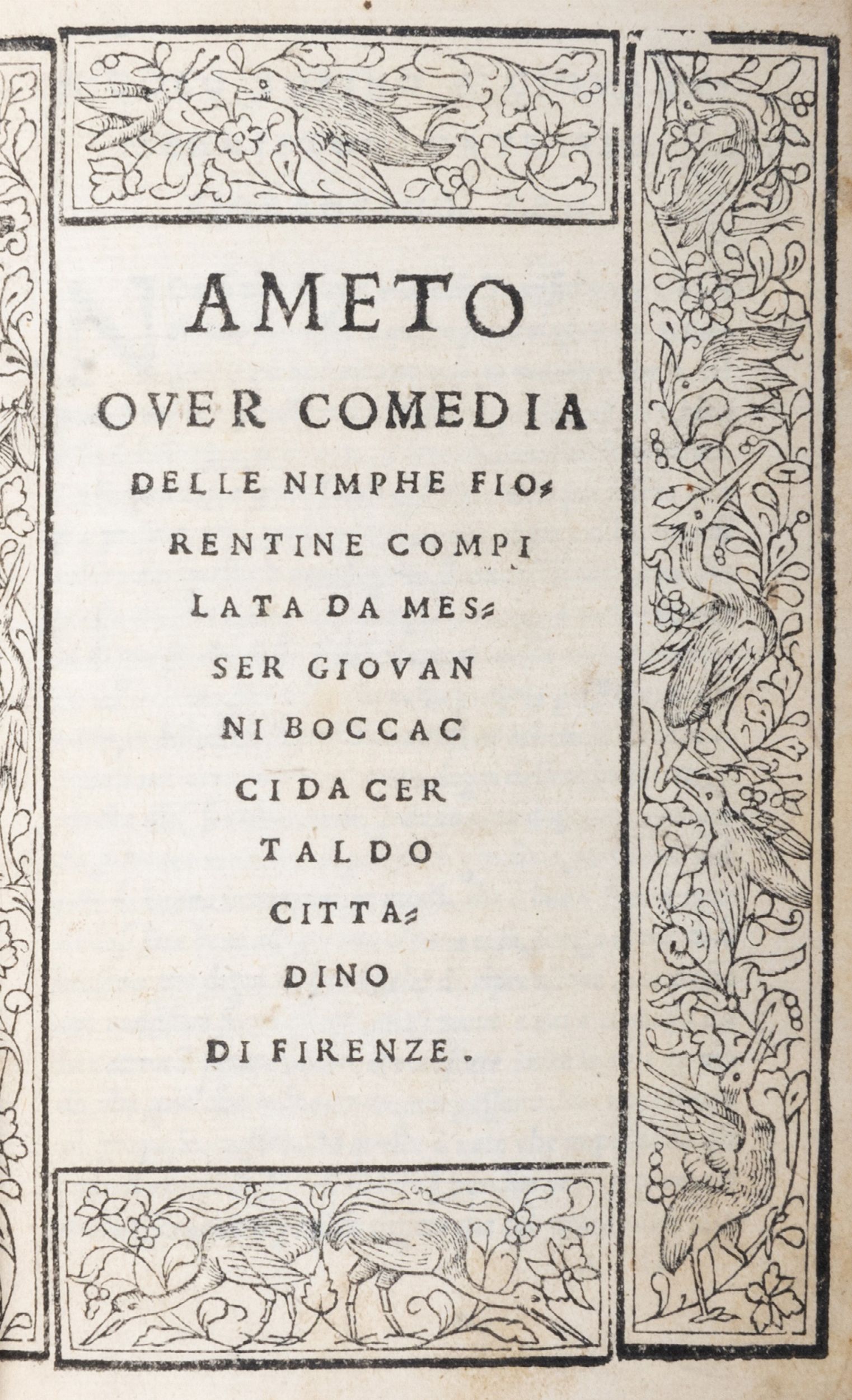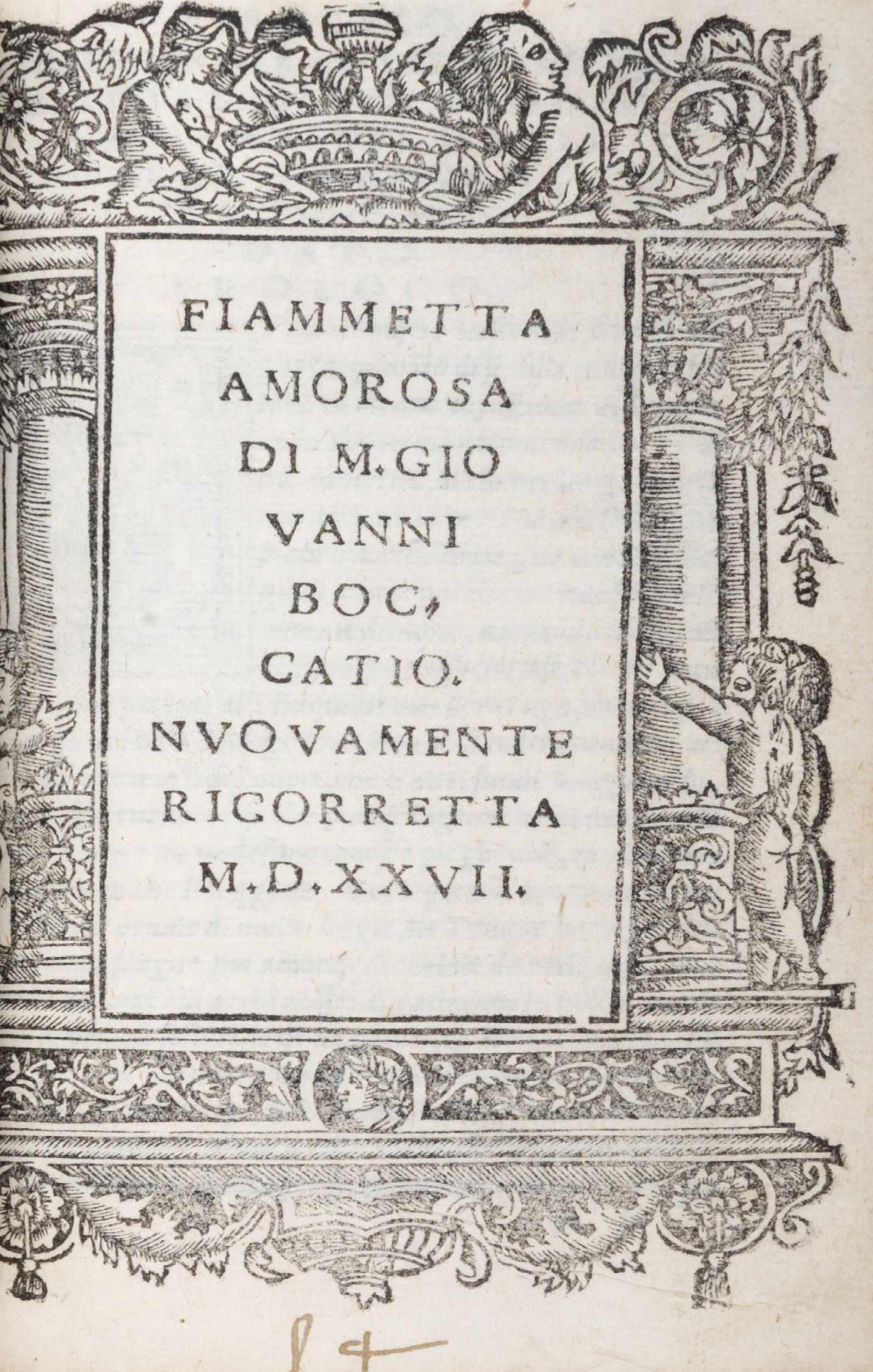 1526 Venezia, Gregorio de Gregori, 1526. In 8°. Frontespizio racchiuso entro cornice xilografica con elementi fitomorfi e uccelli, alcuni versi di mano cinquecentsca alla I carta e nota di possesso coeva di G. Giacomo Bosso alla terza carta. Legato con: Fiammetta Amorosa. Venezia, Bindoni e Pasini, 1527. Frontespizio entro cornice xilografica con colonne, putti e altre decorazioni, strappo senza perdita alla carta B4, splendida legatura cinquecentesca alla Fortuna, con la fortuna che cavalca un delfino e il motto su entrambi i piatti VIRBIAM SERVO, difetti al dorso e ai capitelli di testa e di piede.