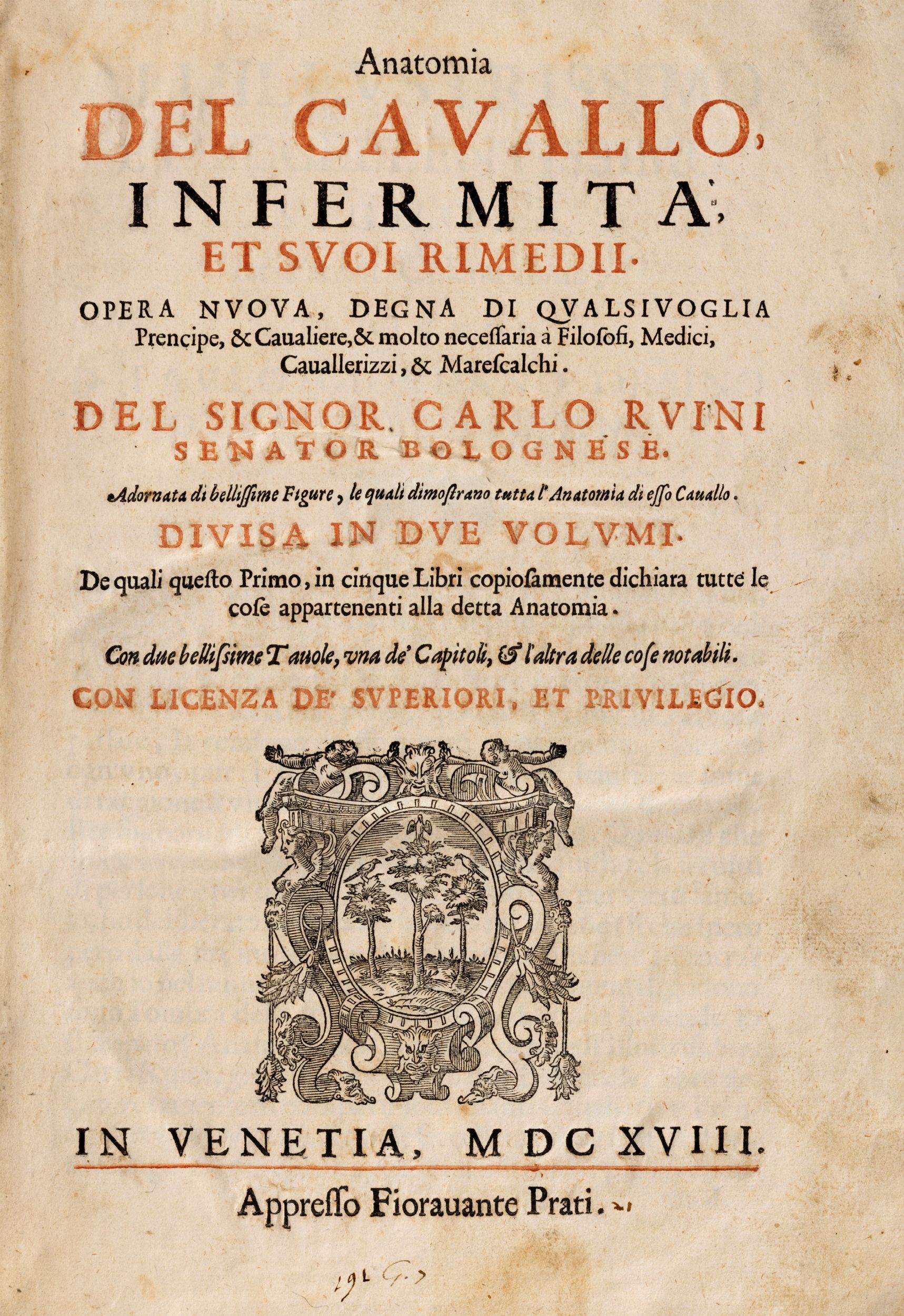 1618 Venezia, Fioravante Prati, 1618. In-folio, frontespizio del primo volume in rosso e nero, (2cc), 1-247pp, (10cc); (1c),1-300, (9cc), 1cb., legatura in piena pergamena coeva, titolo manoscritto al dorso. Secondo volume con suo proprio frontespizio. Numerose illustrazioni xilografiche, iniziali e finalini xilografici. Sui frontespizi marca tipografica (Tre alberi in un prato, ciascuno con un uccello sulla cima, entro cornice figurata).