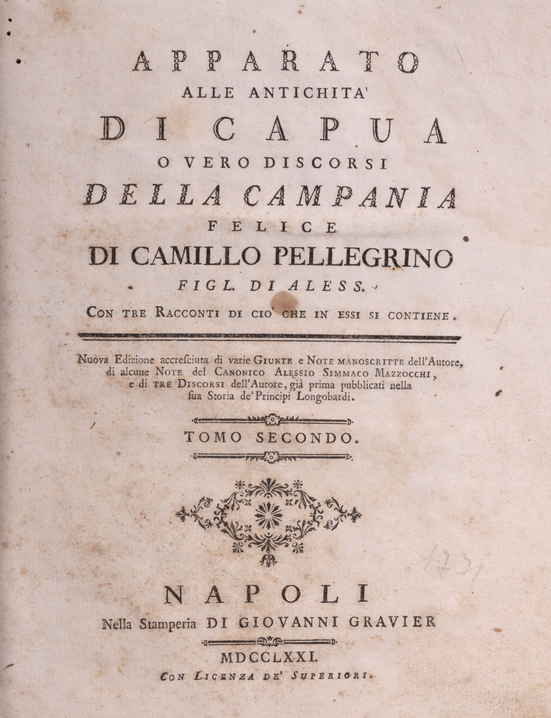 Napoli, Gravier, 1771. In 4°, voll. 2, pp. (8)-XLIII (compreso front. e stemma inciso su legno)-496-(8)-VII-38-352, con due grandi carte topografiche incise su rame e più volte ripiegate: Campania Felix e Capua. Legatura coeva in piena pergamena, titolo in oro al dorso, tagli colorati.