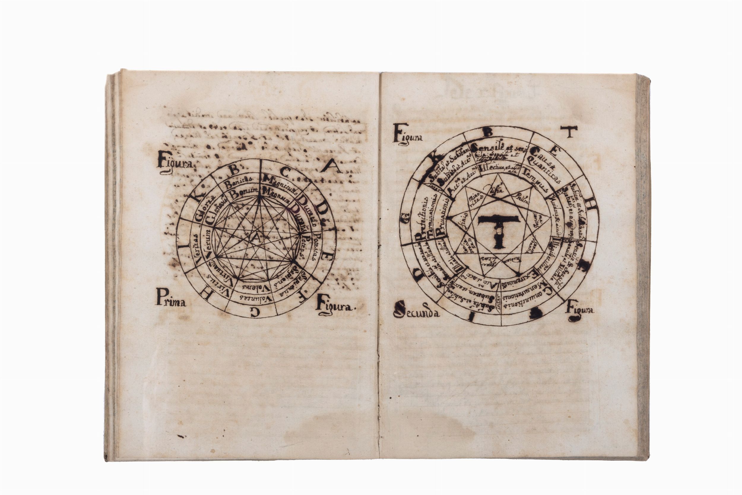 1650 Manoscritto cartaceo di 84 cc. con ruote e disegni mnemonici, elegante corsivo, databile alla prima metà del sec.XVII, legatura coeva in piena pergamena, inchiostro acido che in alcuni punti ha trapassato la carta sottile. Tracce di antiche provenienze alla prima carta.