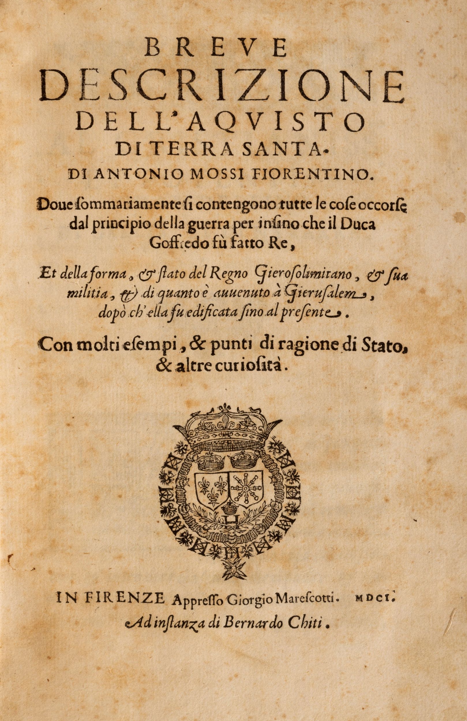 1601 Firenze, Giorgio Marescotti, 1601. In 4°, (4cc, ultima c.b. mancante), 74pp, (2cc,u.b.). Stemma del re Enrico IV di Francia e Navarra sul frontespizio, iniziali xilografiche, fregi xilografici, marca editoriale in fine (Galeone sul mare in tempesta sospinto dai venti. In cornice in basso iniziali GM. Motto Et vult et potest). Legatura in pergamena morbida, titolo manoscritto al dorso.