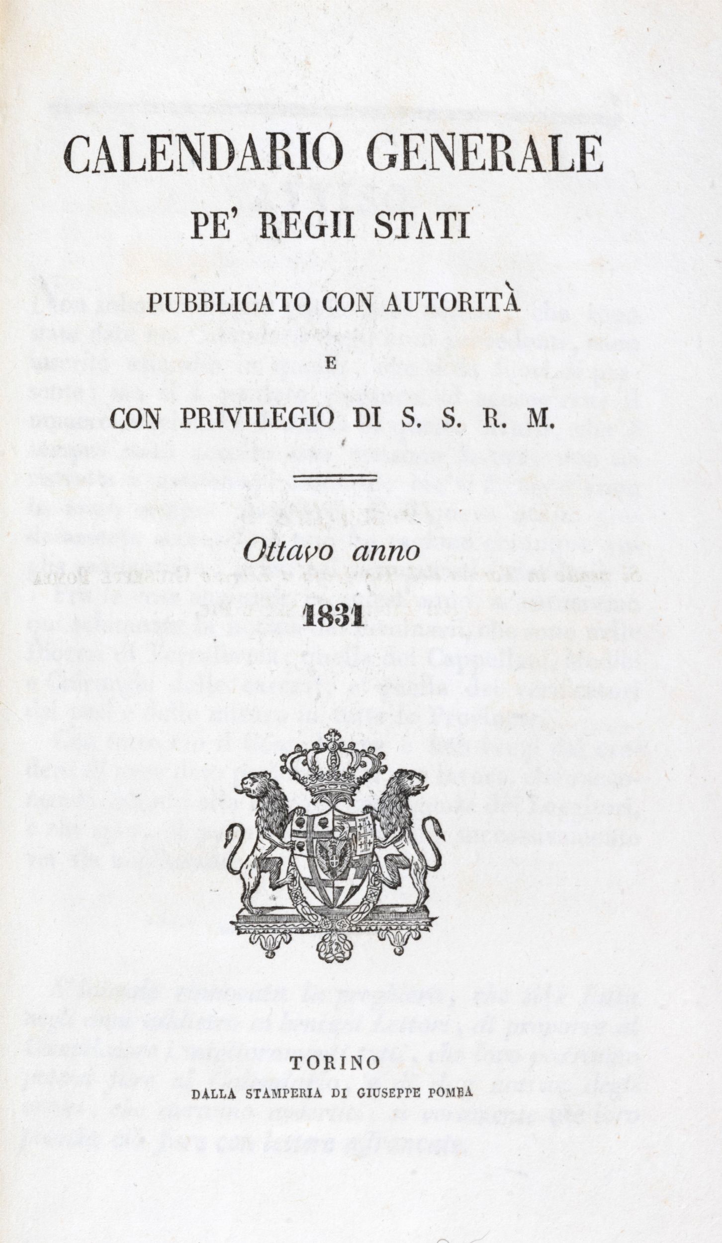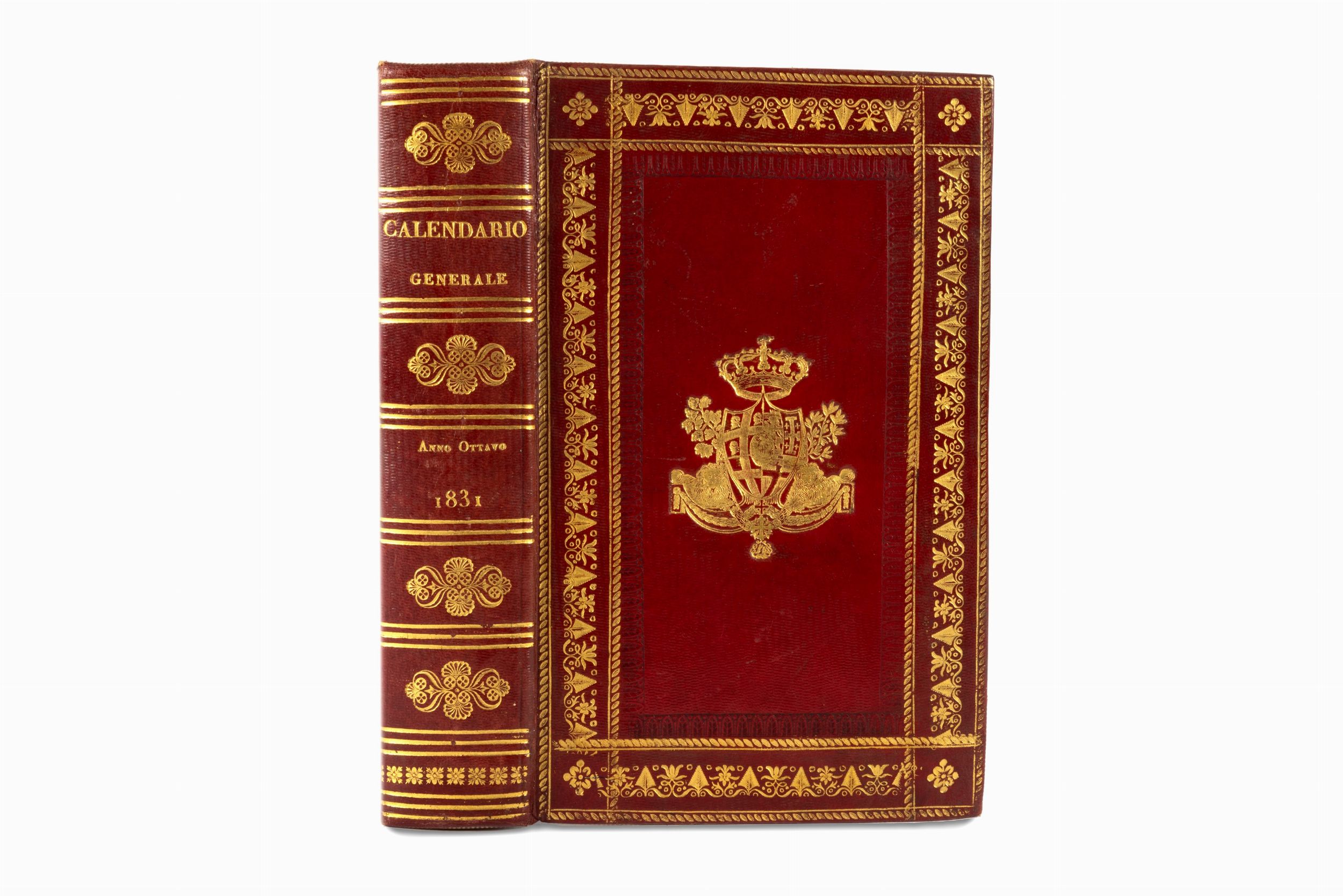 Torino, Giuseppe Pomba, 1831.In 8 grande. Al frontespizio stemma calcografico Savoia, calendario dell'anno con i mesi disposti su diverse colonne ciascuno con i simboli dello zodiaco, sporadiche macchie, legatura coeva in marocchino rosso, ai piatti diverse cornici impresse in oro ed a secco, al centro del campo le armi reali di Vittorio Emanuele I di Savoia sormontate da corona, dorso liscio, ai comparti titolo, anno e fregi floreali, tagli dorati, lievi graffi.