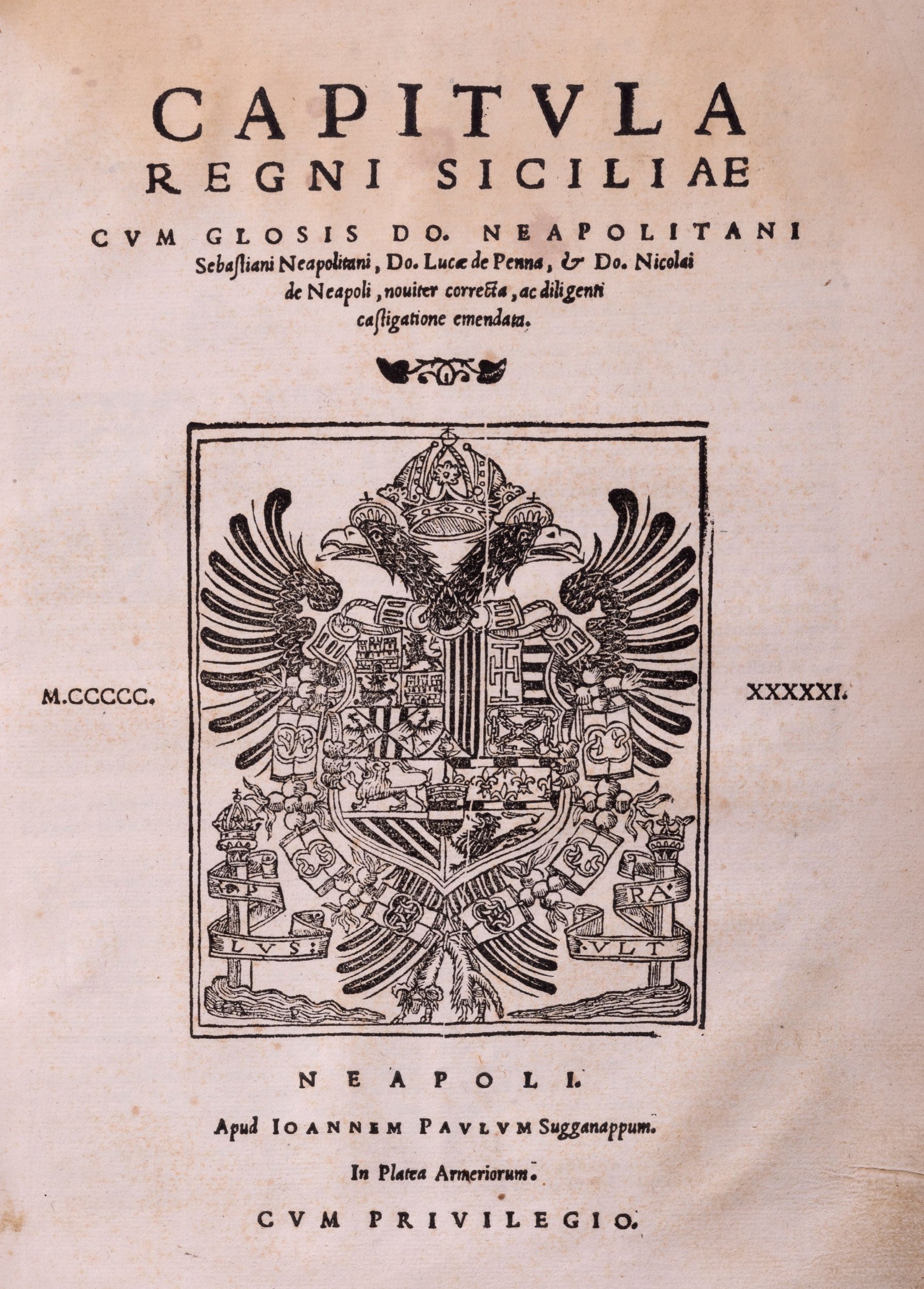 Napoli, apud Ioannem Paulum Sugganappum, 1551. In Folio, tre parti in un volume, grande stemma del Regno di Napoli ai tre frontespizi, pp. (2)-84 (mal numerate 94); (2)-30;( 2)-72-(2), artistiche iniziali xilografiche, antiche e copiose glosse a penna ai margini. Testo su due colonne. Legatura posteriore in piena pergamena, titolo calligrafico.