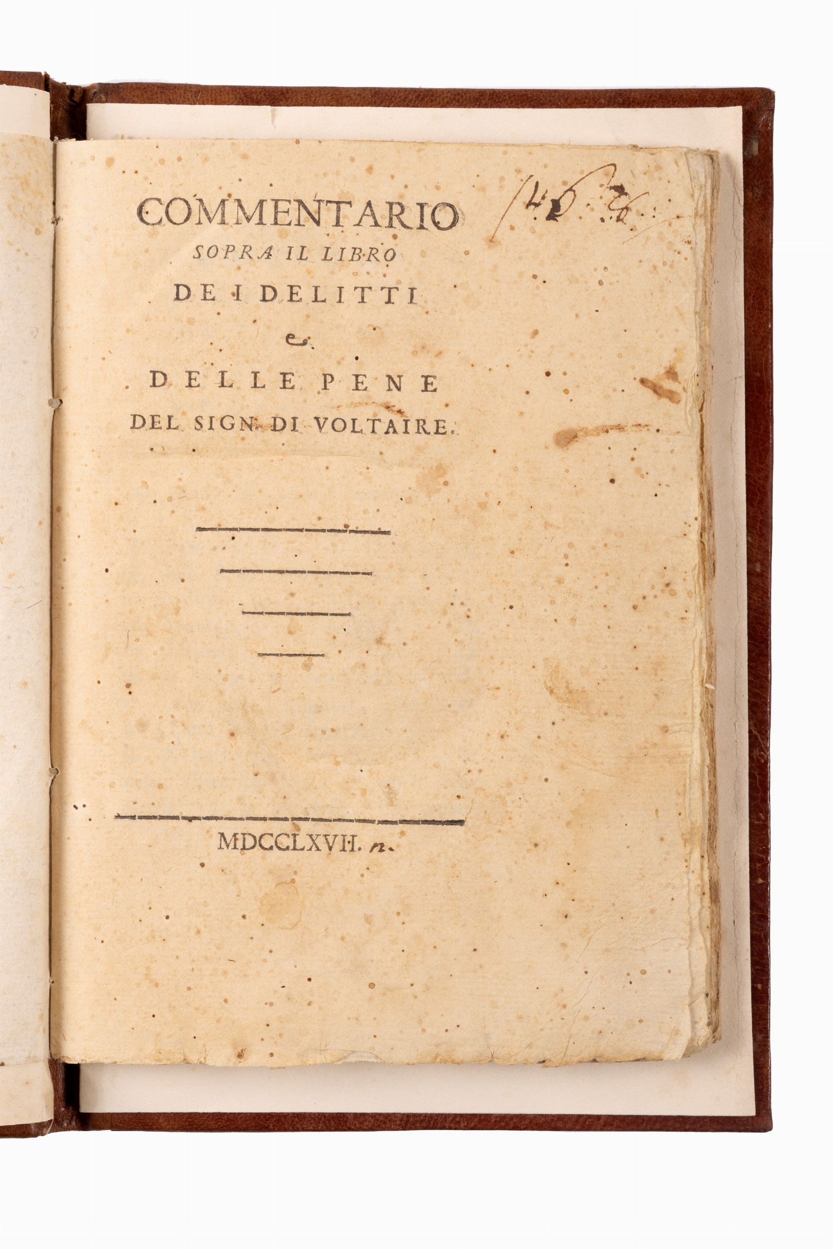 1767 s.e., s.l., 1767. In 8°. Esemplare in barbe, gore al margine inferiore, lievi arrossature e fioriture sparse, qualche piccola macchia al frontespizio, bella legatura del sec. XIX in marocchino, eleganti fregi in oro ai piatti, piccola mancanza alla cuffia, pochi leggeri graffi.