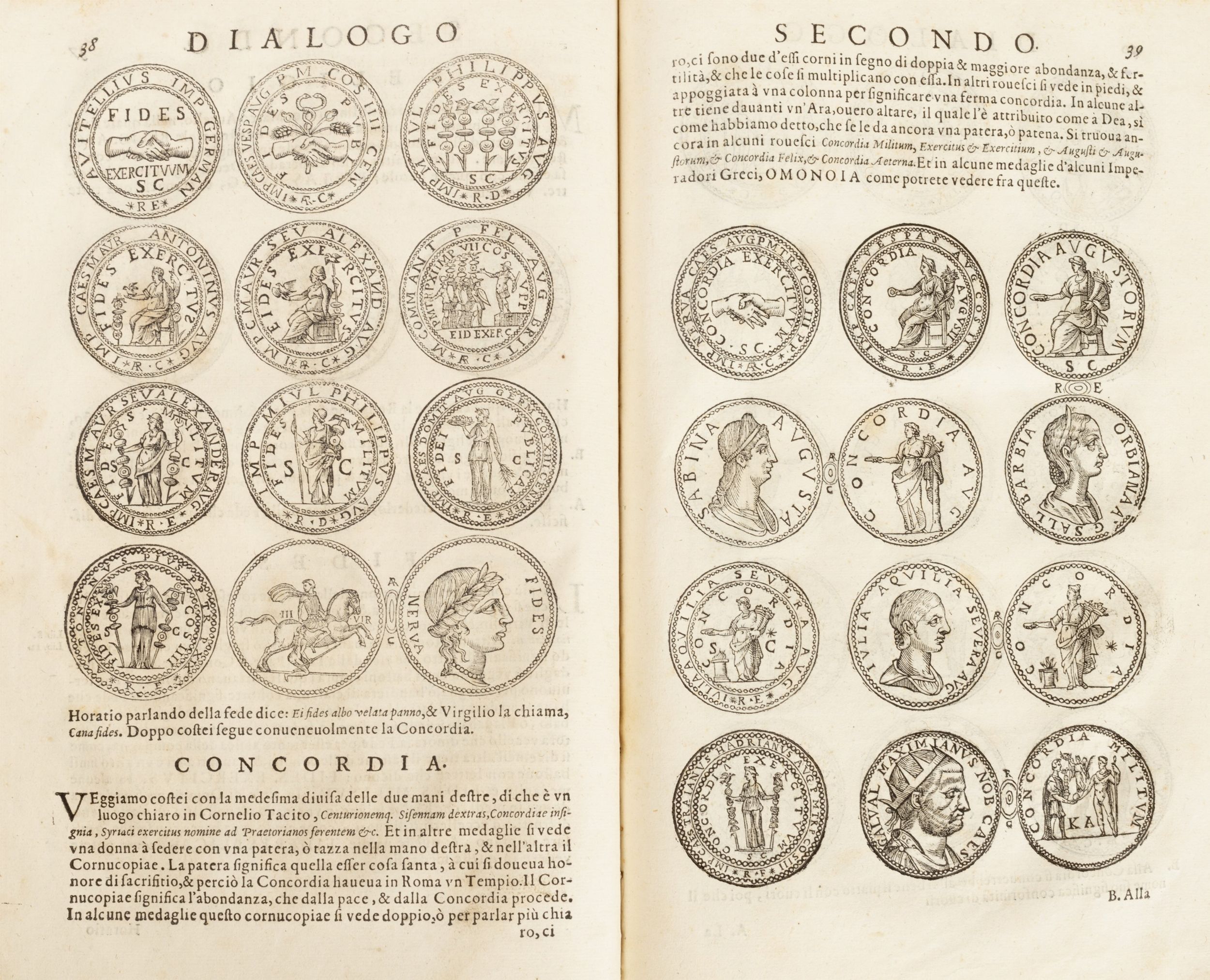 1650 Roma, s.l., s.d.. [ Guglielmo Faciotto, 1592]. In 2°. Frontespizio architettonico, numerose incisioni xilografiche nel testo, diversi restauri, carta A1 mancante e supplita da replica manoscritta, mancanze a 2E1, M1. N2, S2 supplite con carta manoscritta, strappo al margine bianco esterno di O1, mancanti *6 e 2P-2S4 [croce greca]6, fioriture sparse, leggera brunitura, legatura coeva in pergamena, tagli blu, titolo impresso in oro al dorso, piccola mancanza alla cuffia, lievi difetti.