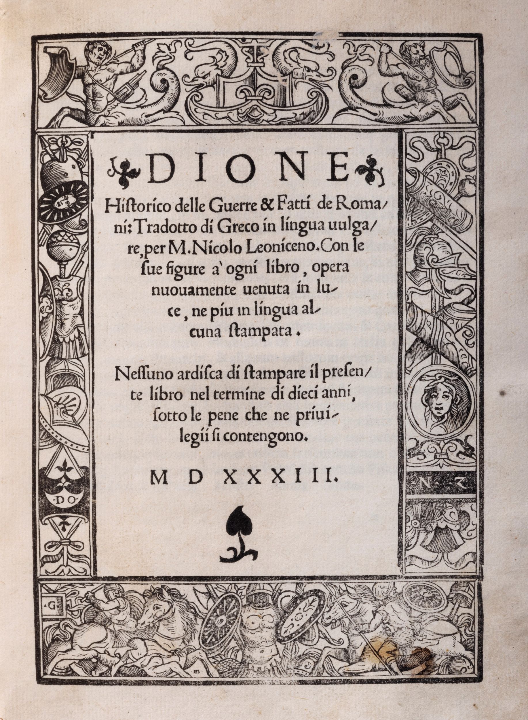 1533 Venezia, Nicolo d'Aristotile di Ferrara detto Zoppino, 1533. In 4°, frontespizio inserito in artistica cornice xilografica a motivi classici, 6 cc. nn. 282 cc. numerate (mancanze, restaurate, al margine bianco delle ultime 3 cc.), con il ritratto dell'autore al verso della quarta carta e 23 artistiche xilografie di gusto popolare poste all'inizio di ciascun libro, la maggior parte delle quali riporta i monogrammi TMPF, mf o mpf, attribuibili secondo Essling a Matteo Pagano da Treviso. Legatura coeva in piena pergamena molle, titolo calligrafico.