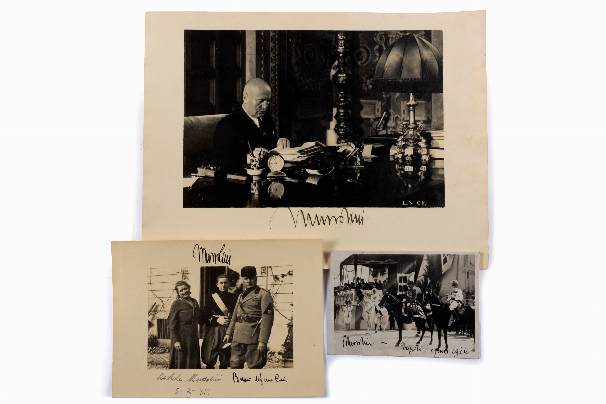 1926 Lotto di tre fotografie di Mussolini con firma autografa, datate 1926 e 1938 (quest'ultima ritrae Mussolini con Rachele e Bruno, con le loro firme)