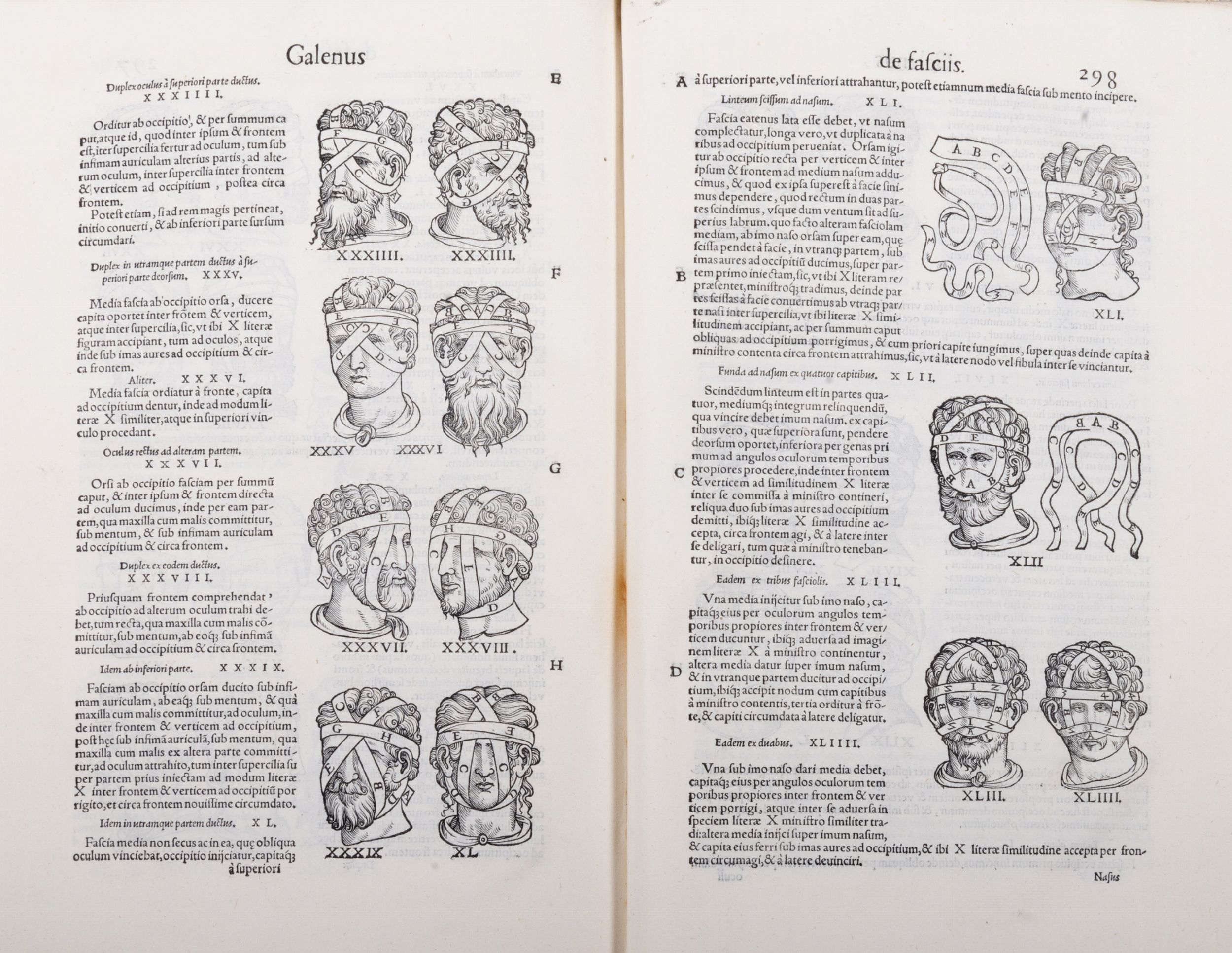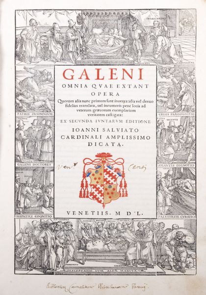 Venezia, Giunta, 1550. In 2°. 7 tomi in 6 voll. Tomo I con frontespizio stampato in rosso e nero e con una larga bordura xilografica con scene di natura medica, al centro lo stemma del dedicatario Cardinale Giovanni Salviati con aggiunte miniate in giallo, blu e in oro per la croce cardinalizia, testatine allegoriche xilografiche, capilettera e fregi, ciascun tomo con frontespizio xilografico e marca all'inizio ed in fine, esemplare di studio con annotazioni di mano antica ai margini , qualche macchia ed aloni, alcune carte lente, legatura in pergamena dell'epoca manoscritto lungo il dorso, difetti e mancanze. Firma di appartenenza ai frontespizi.