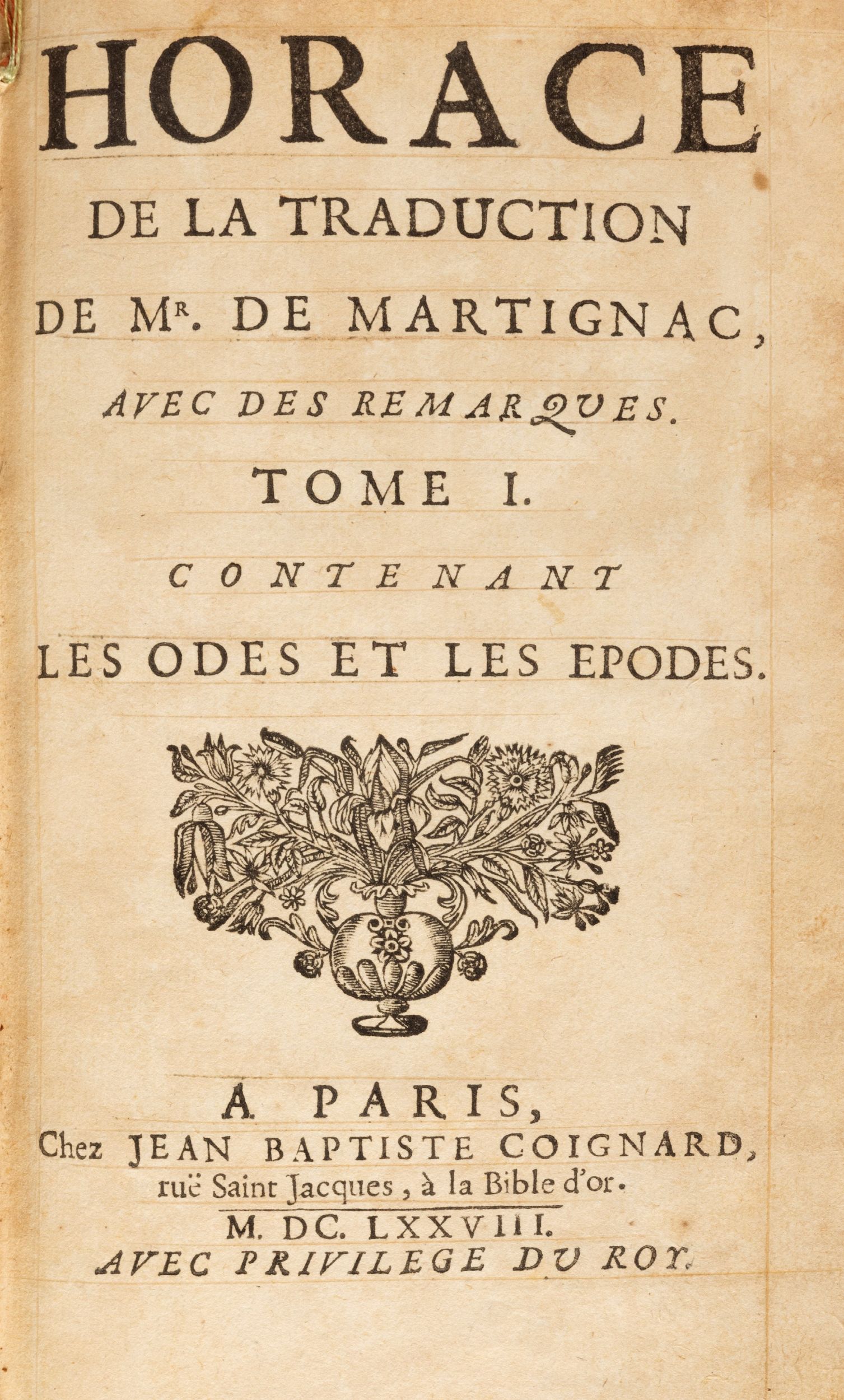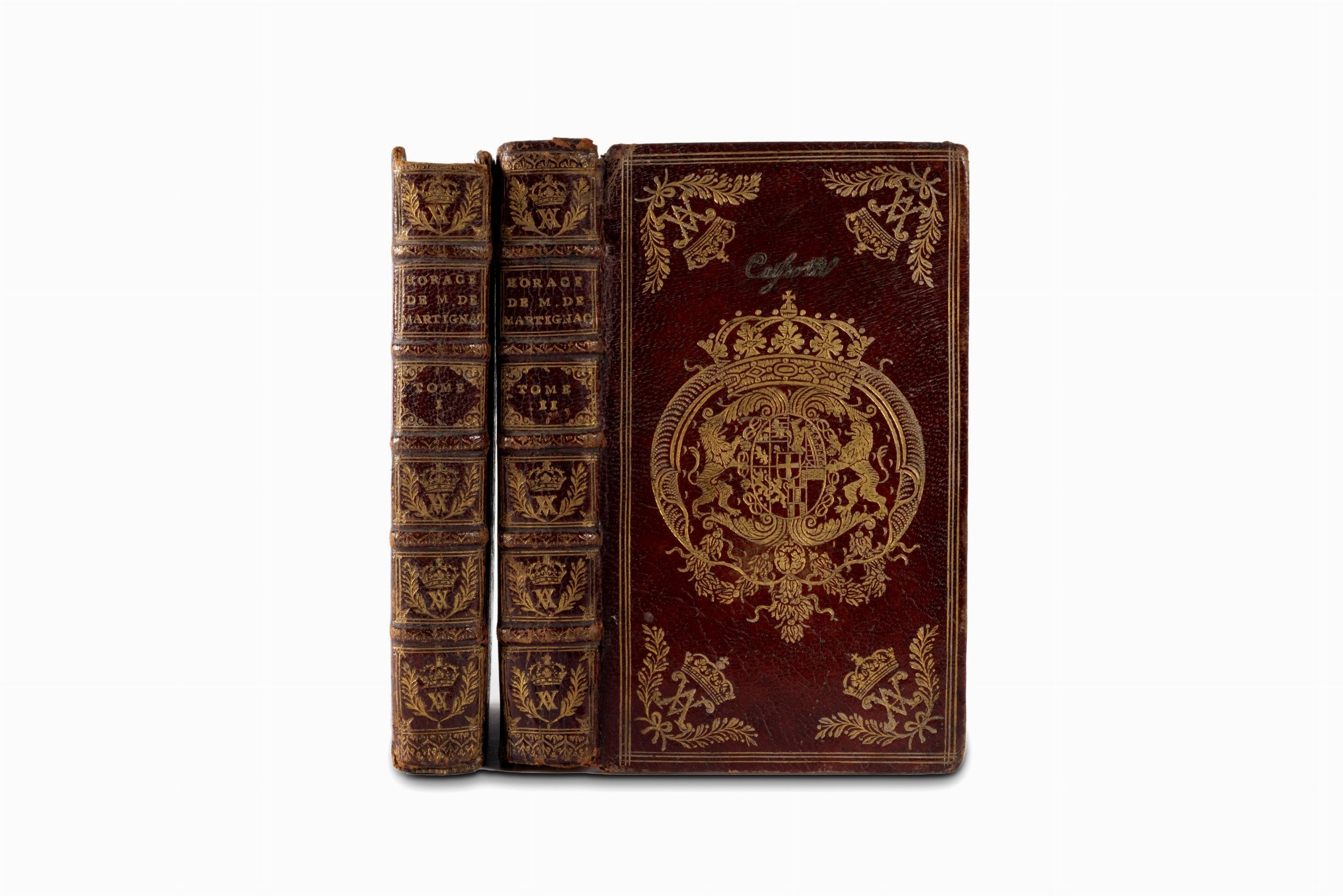 Parigi J.-B. Coignard, 1678. In 12°. 2 voll. Al frontespizio del primo tomo fregio calcografico, testatina alle armi del dedicatario dell'opera, alle sguardie incollate ex libris incisi col motto Il più bel fior ne cogli, in entrambi i tomi qualche lieve macchia e brunitura, legatura in marocchino rosso con decorazione impressa in oro, cornici ai piatti e agli angoli festoni di foglie e monogramma coronato Va - Vittorio Amedeo, al centro del campo le armi di Casa Savoia, al dorso a 4 nervi titolo dell'opera, monogramma di Vittorio Amedeo, tagli dorati, ai piatti anteriori supralibros Caissotti (di Chiusano), difetti alle cuffie e alla cerniera.