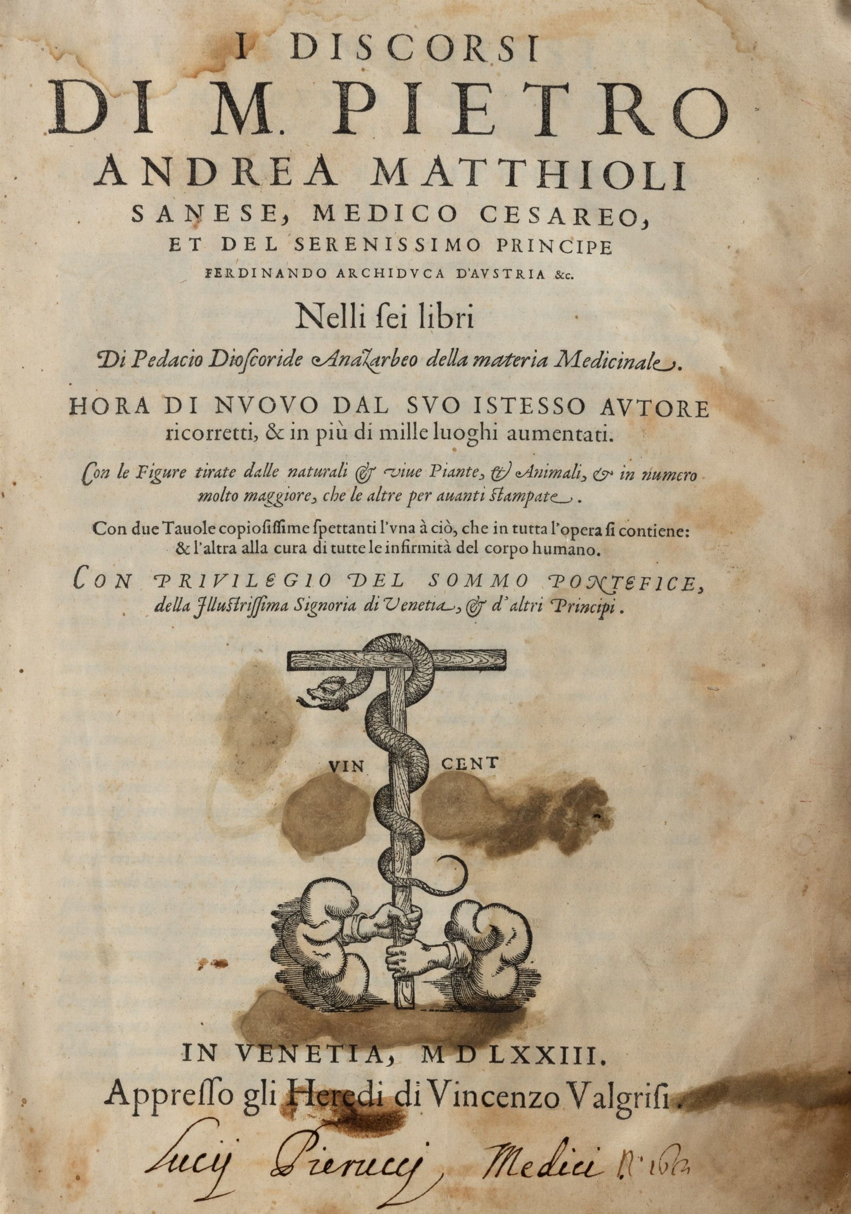 1573 Venezia, Eredi di Vincenzo Valgrisi, 1573. In folio, (90cc), 971 pp; (6cc). Frontespizio con marca editoriale (Serpente attorcigliato a un bastone a forma di Tau sostenuto da mani uscenti da nuvole. Scritta: Vincent), colophon a c 4M6r. Iniziali xilografiche, illustrazioni xilografiche nel testo, legatura in piena pergamena rigida coeva, dorso restaurato, titolo manoscritto al dorso, tagli in rosso.
