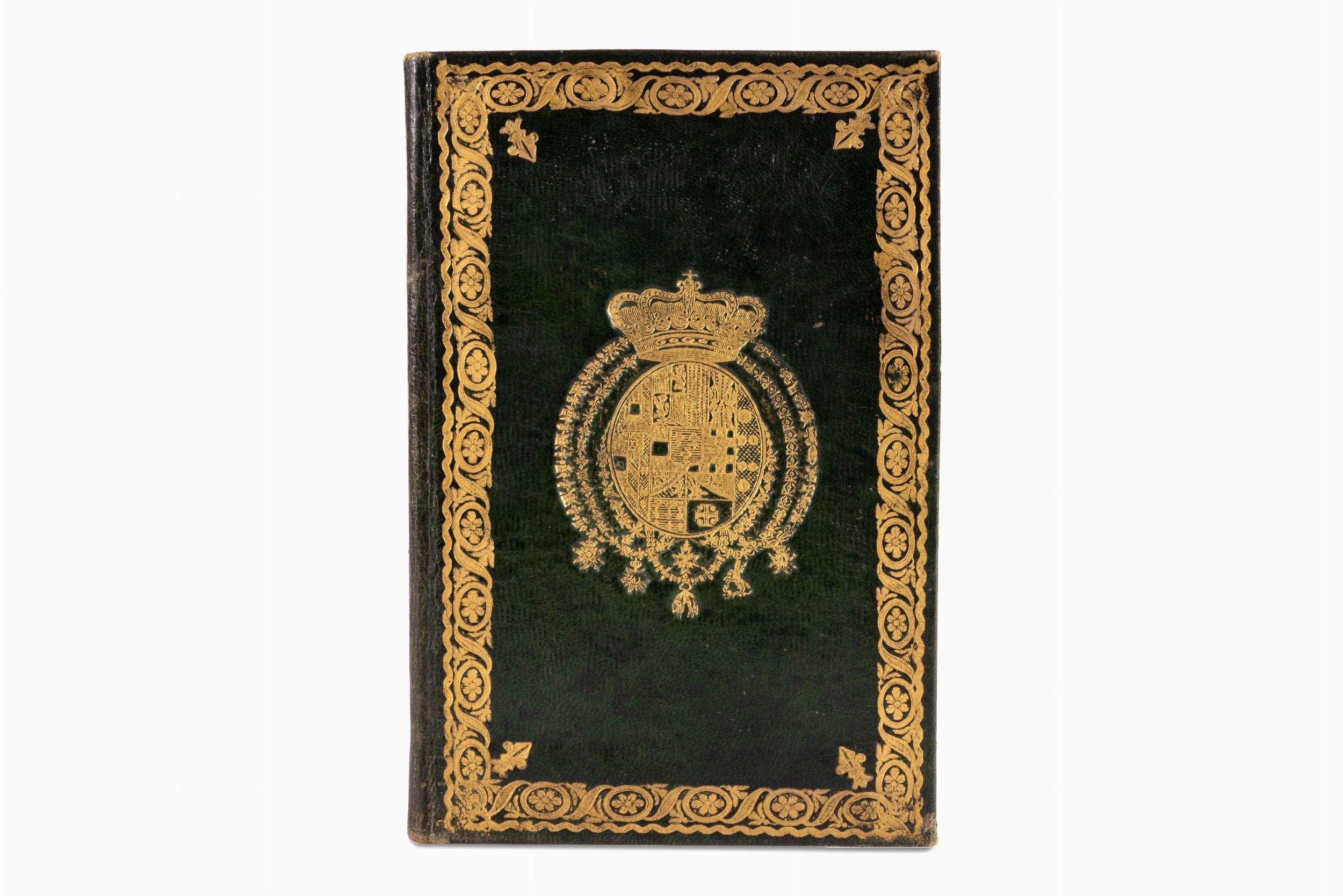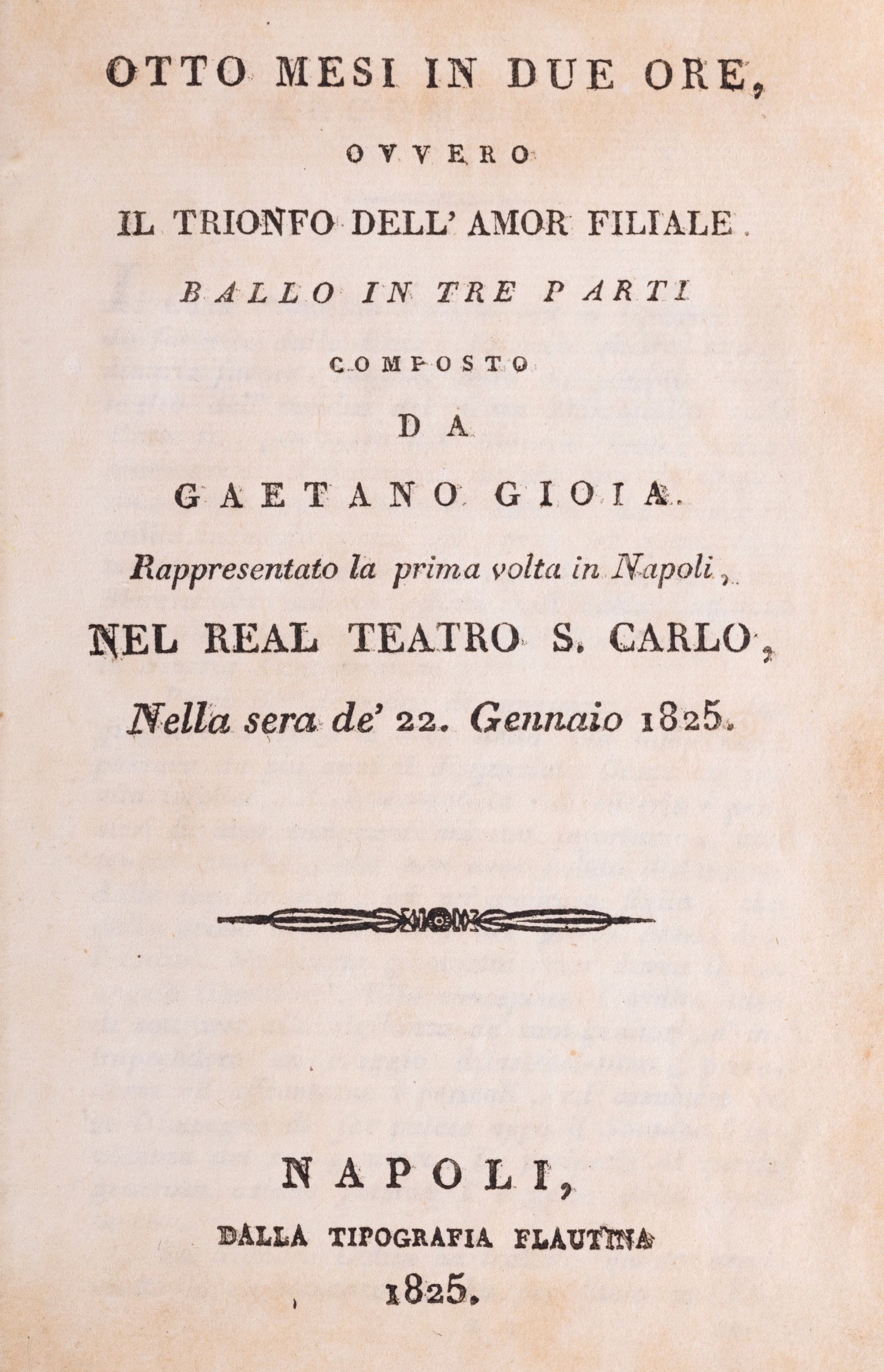 Napoli, tipografia Flautina, 1838. In 8 °. Fregio al frontespizio, legatura in vitello verde con decorazione impressa in oro, piatti inquadrati da cornice di rotella, al centro del campo centrale grande stemma di Francesco I delle due Sicilie sormontato da corona, lievi difetti. § Gaetano Gioia, Otto mesi in due ore, ovvero il trionfo dell'amore filiale. Ballo in tre parti. Napoli, tipografia Flautina , 1825. In 8 °. qualche macchia, legatura in marocchino verde a grana lunga, cornice floreale, al centro le armi di Francesco I delle due Sicilie sormontate da corona, lievi difetti.