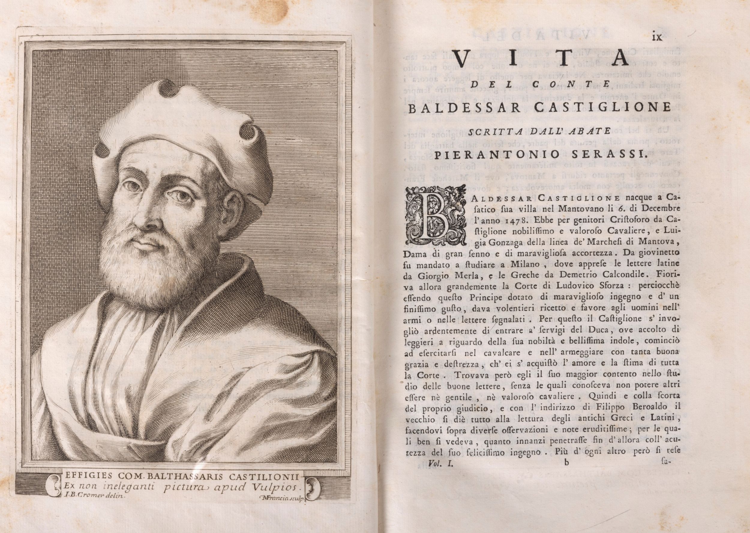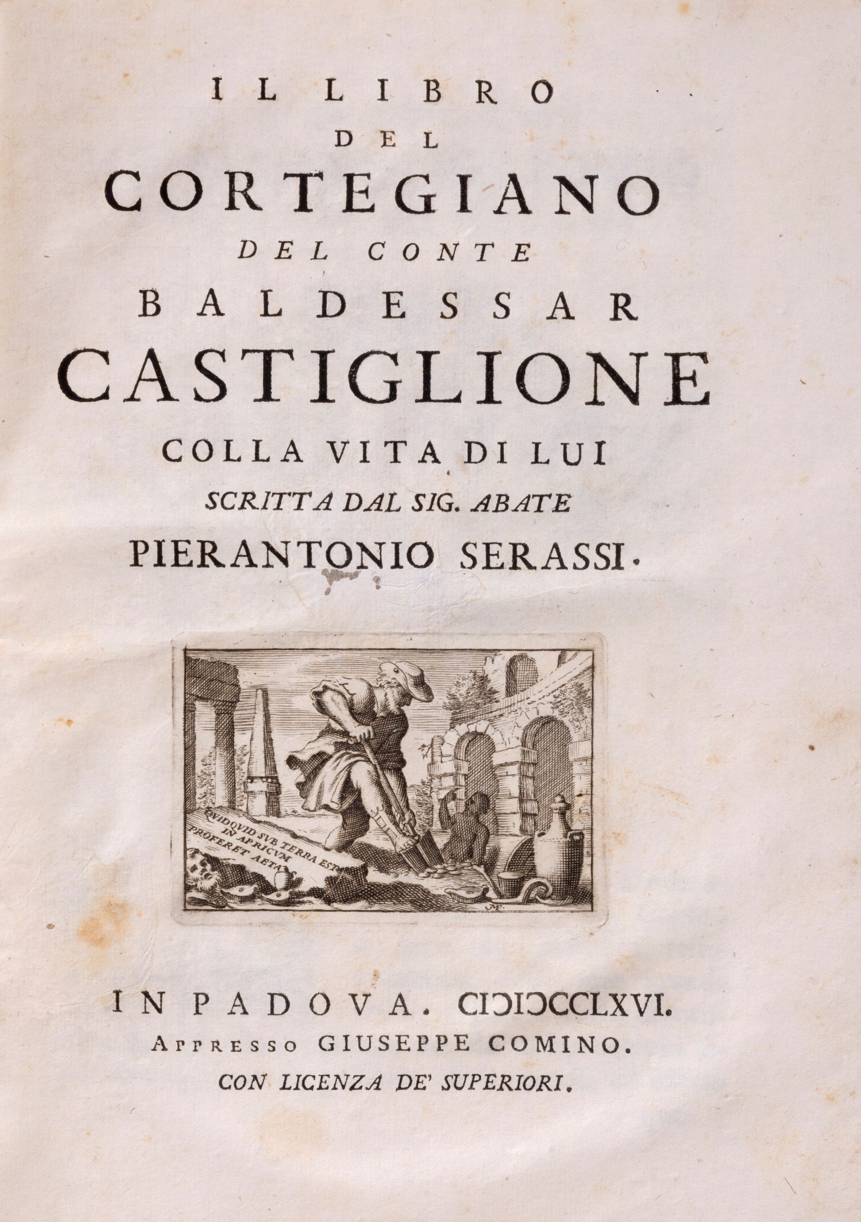 In Padova, appresso Giuseppe Comino, 1766. In 4°, marca tipografica al frontespizio e stemma del Conte Borromeo, cui l'opera è dedicata, incisi su rame, ritratto dell'autore inciso da A. Francia, pp. XXIV-347-(1), iniziali figurate, testatine e finalini incisi. Legatura moderna mz. pergamena, tassello, titolo e fregi in oro al dorso, piccola mancanza alla cuffia superiore, tagli colorati.