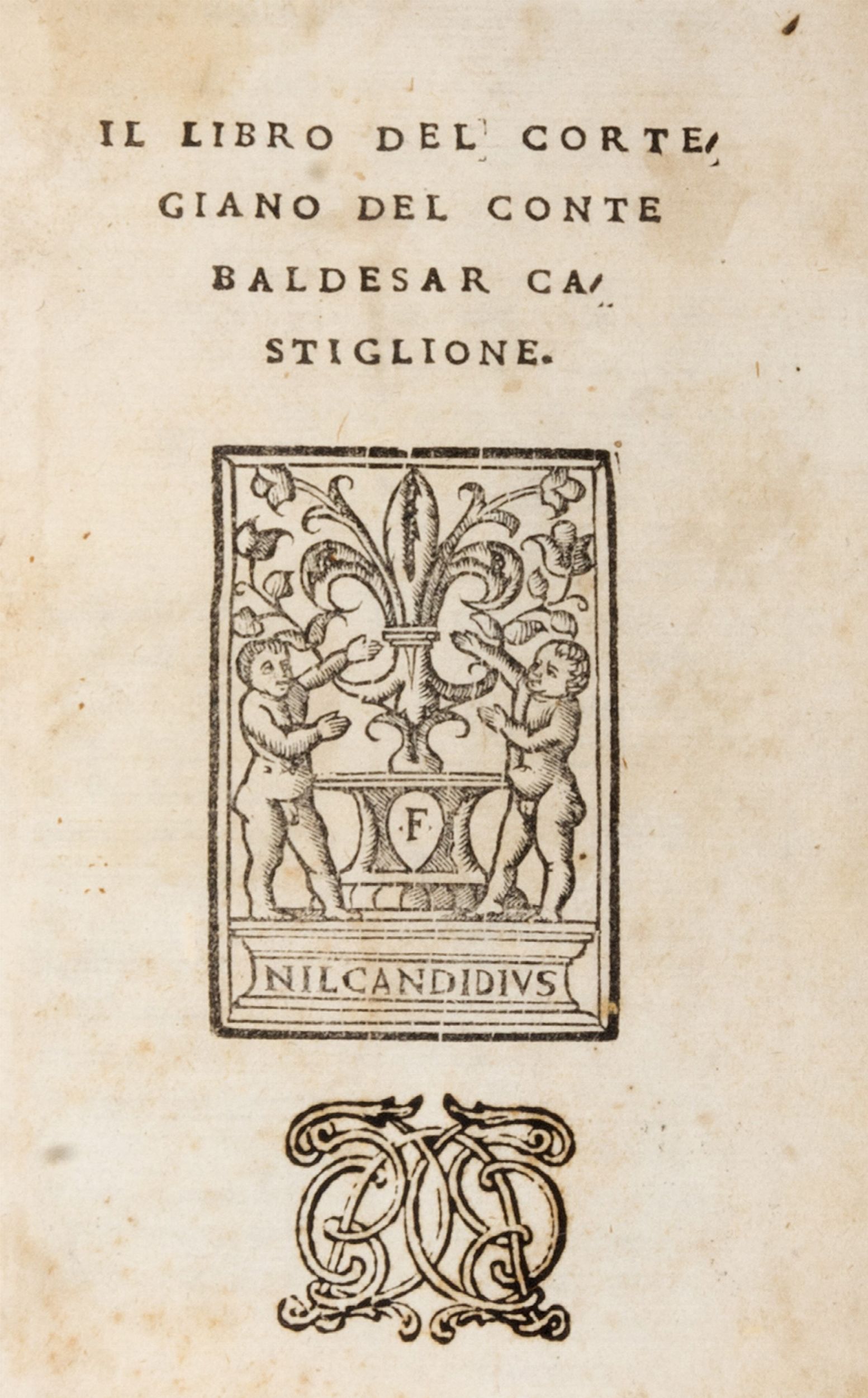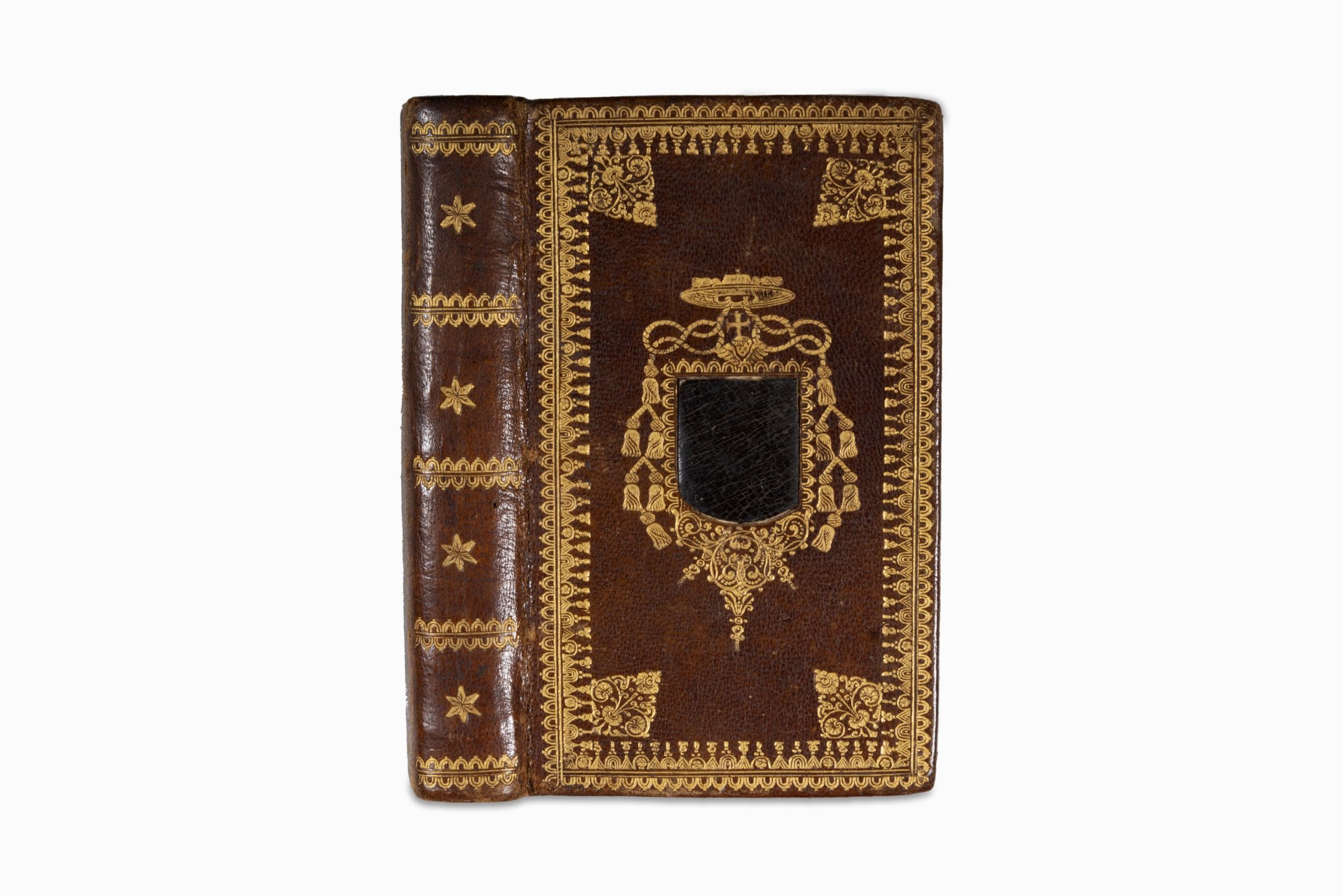 1531 Firenze, eredi Filippo Giunta, 1531. In 8°. Al frontespizio e in fine la marca giuntina con il giglio araldico e i putti a lato, spazi per capilettera con letterine guida, arrossature sparse, alone alle prime carte ed alle ultime con le bianche in parte staccate, legatura in marocchino marrone del sec. XVIII, ai piatti ed al dorso decorazione impressa in oro, al centro del campo, armi non identificate con scudo in marocchino nero sormontato da cappello prelatizio con 3 ordini di fiocchi, al dorso stelle in oro, tagli dorati.