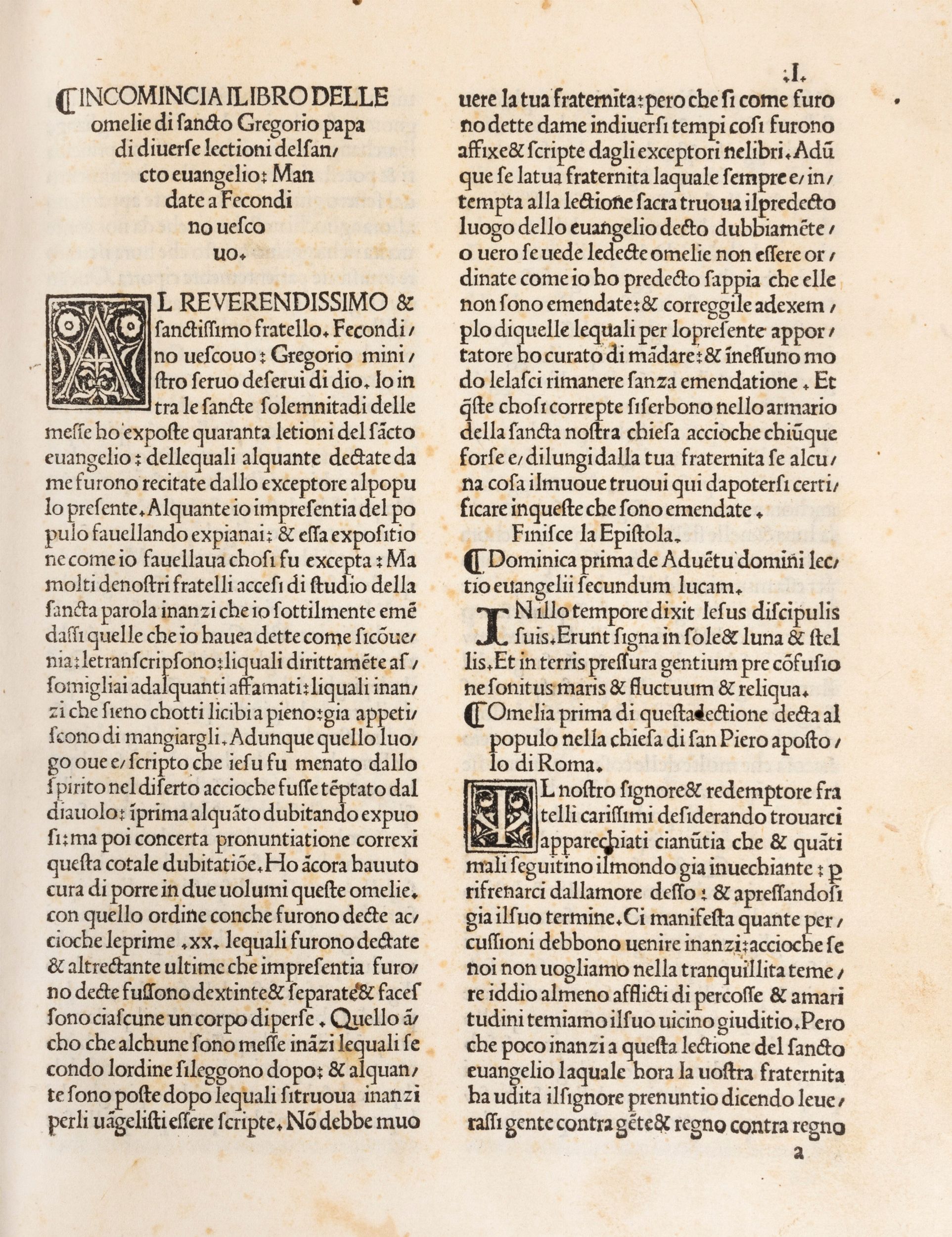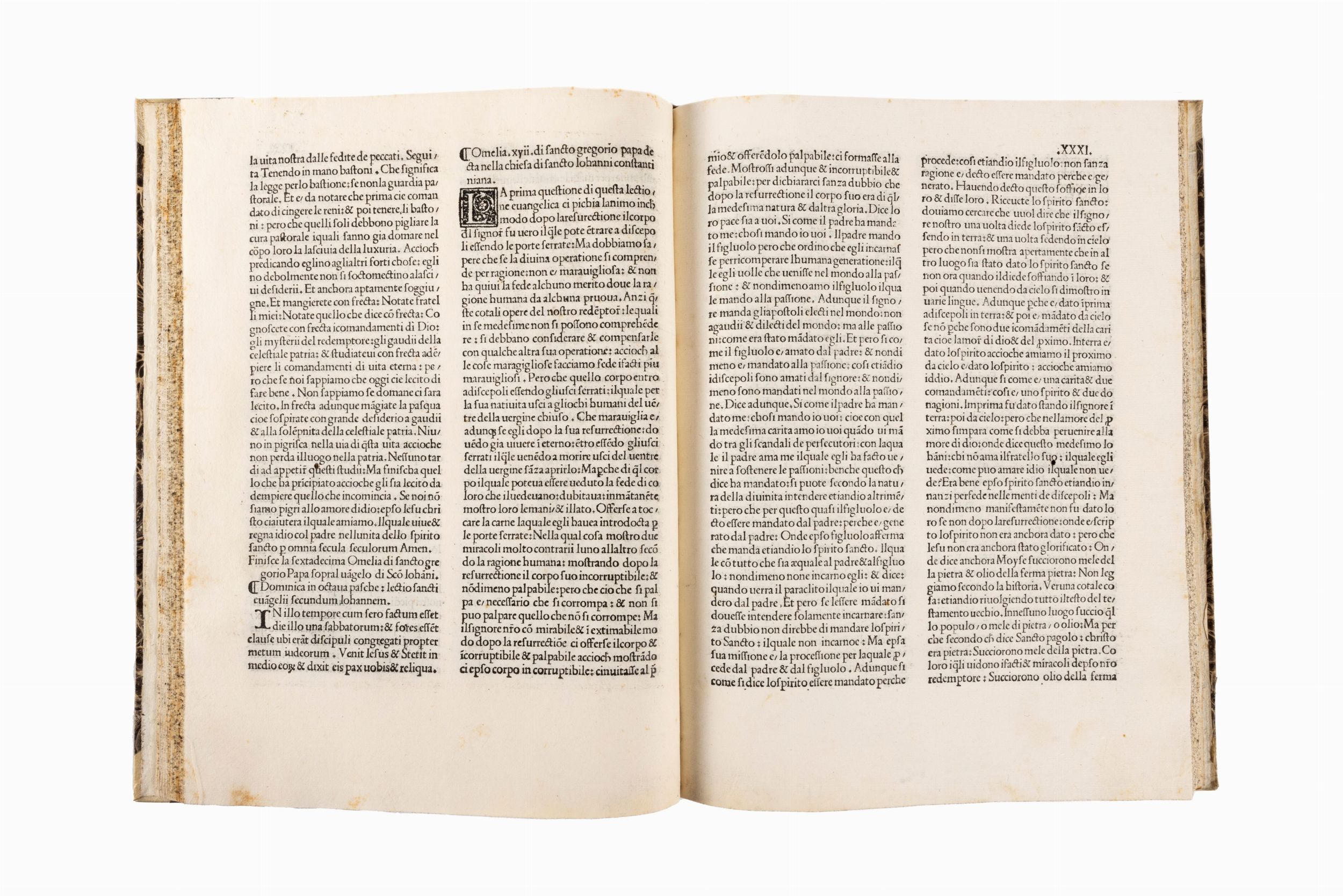 1502 In fine Firenze, s.s. [ma Giunta], 1502. In 2°. Testo disposto su 2 colonne in carattere tondo, graziosi capilettera decorati su fondo nero, piccoli fori di tarlo che corrono lungo tutto l’esemplare, piccola lacuna al margine esterno della prima carta, arrossature sparse e qualche leggera macchia, legatura in mezzo vitello marrone del sec. XIX, dorso a 4 nervi, ad un comparto titolo impresso in oro, tagli a spruzzo, piccoli difetti. Ex libris araldico “Del Conte della Trinità”.