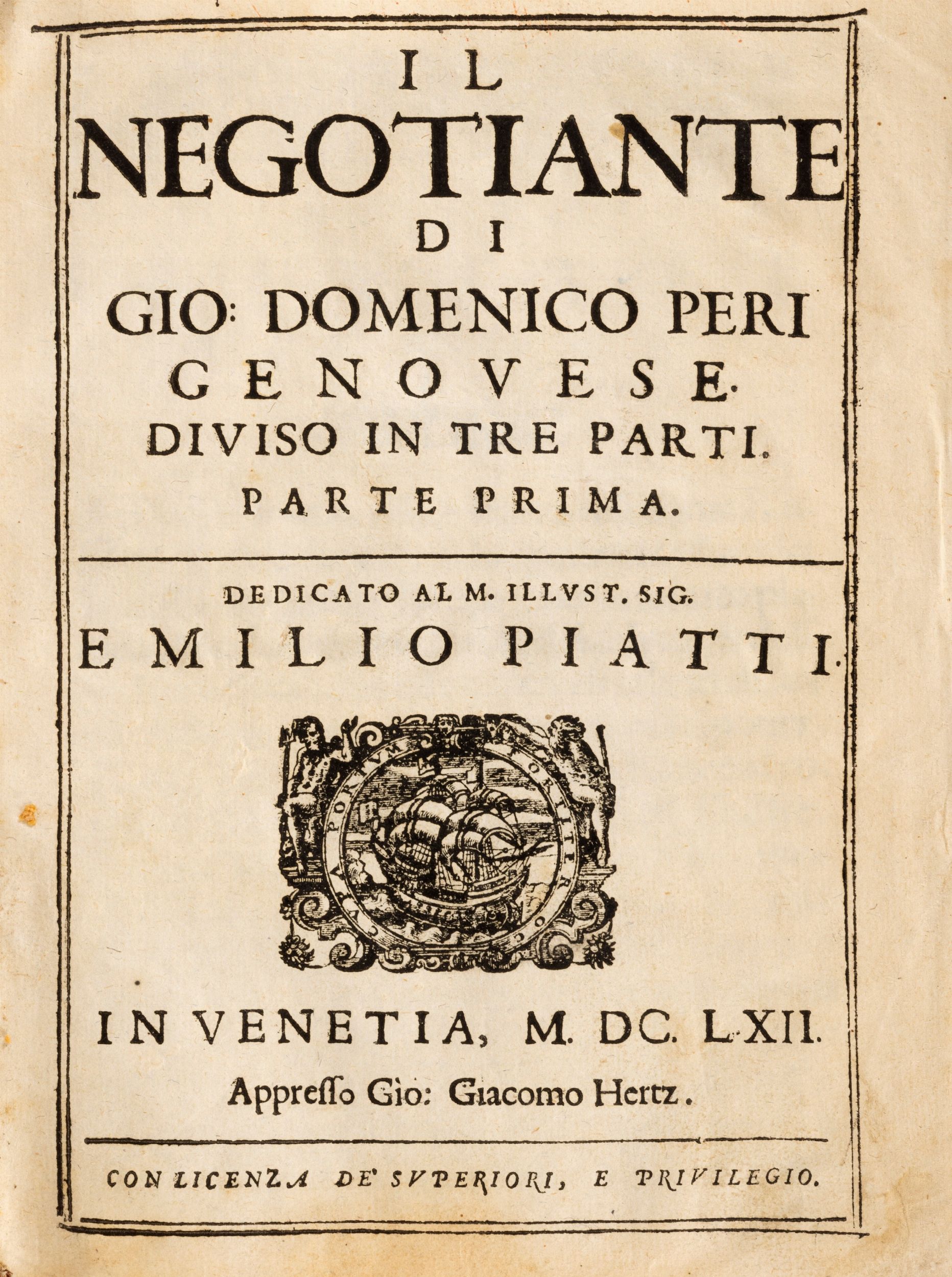 1661 Venezia, Gio. Giacomo Hertz, 1661. In 4°,(4cc), 255pp; (6cc), 168pp. Diviso in tre parti, ciascuna col proprio frontespizio. Rilegato con I Frutti d’albaro impressione seconda,(6cc), 140pp (i.e.180pp), occhietto. Legatura in piena pergamena rigida coeva, titolo manoscritto al dorso.