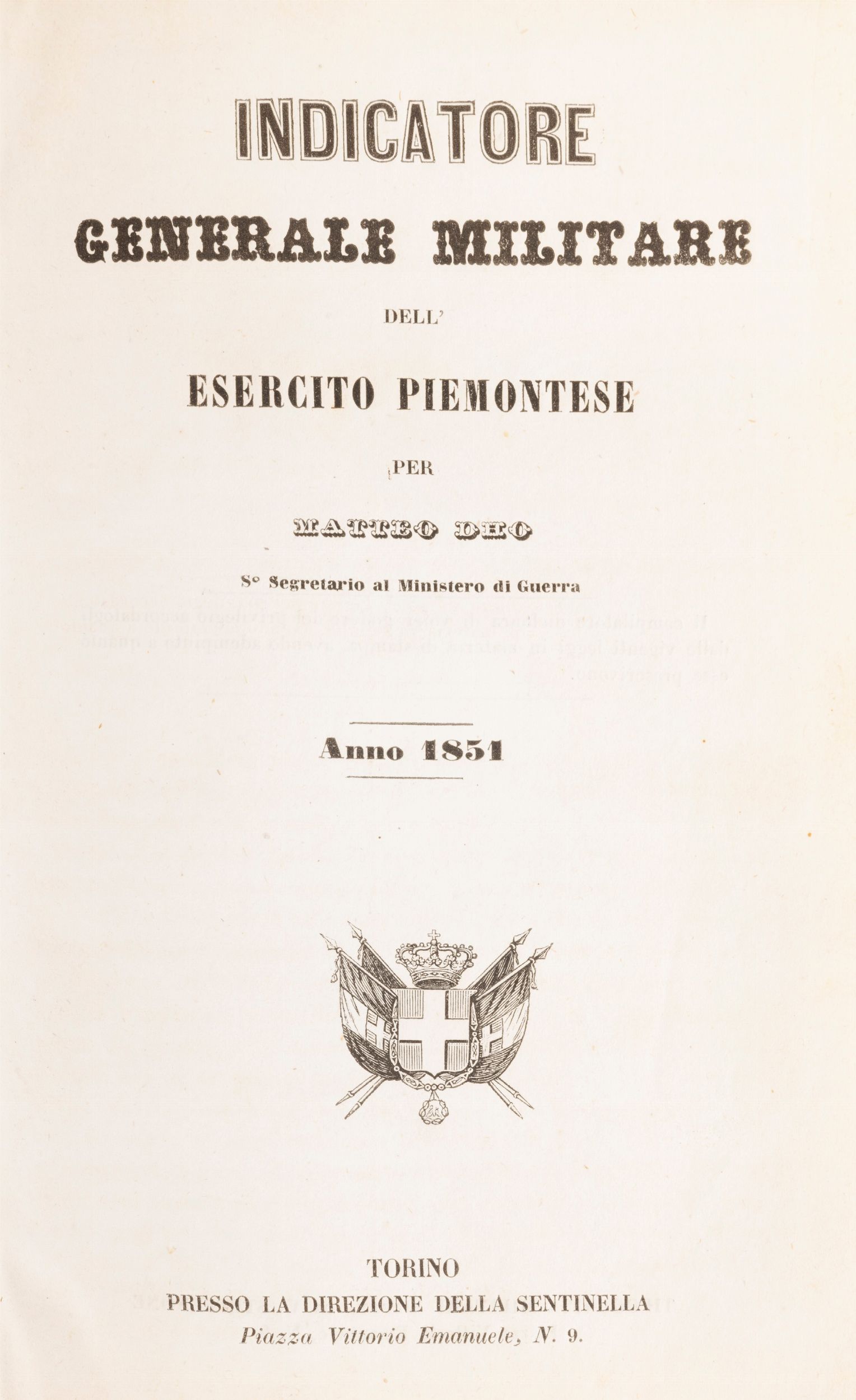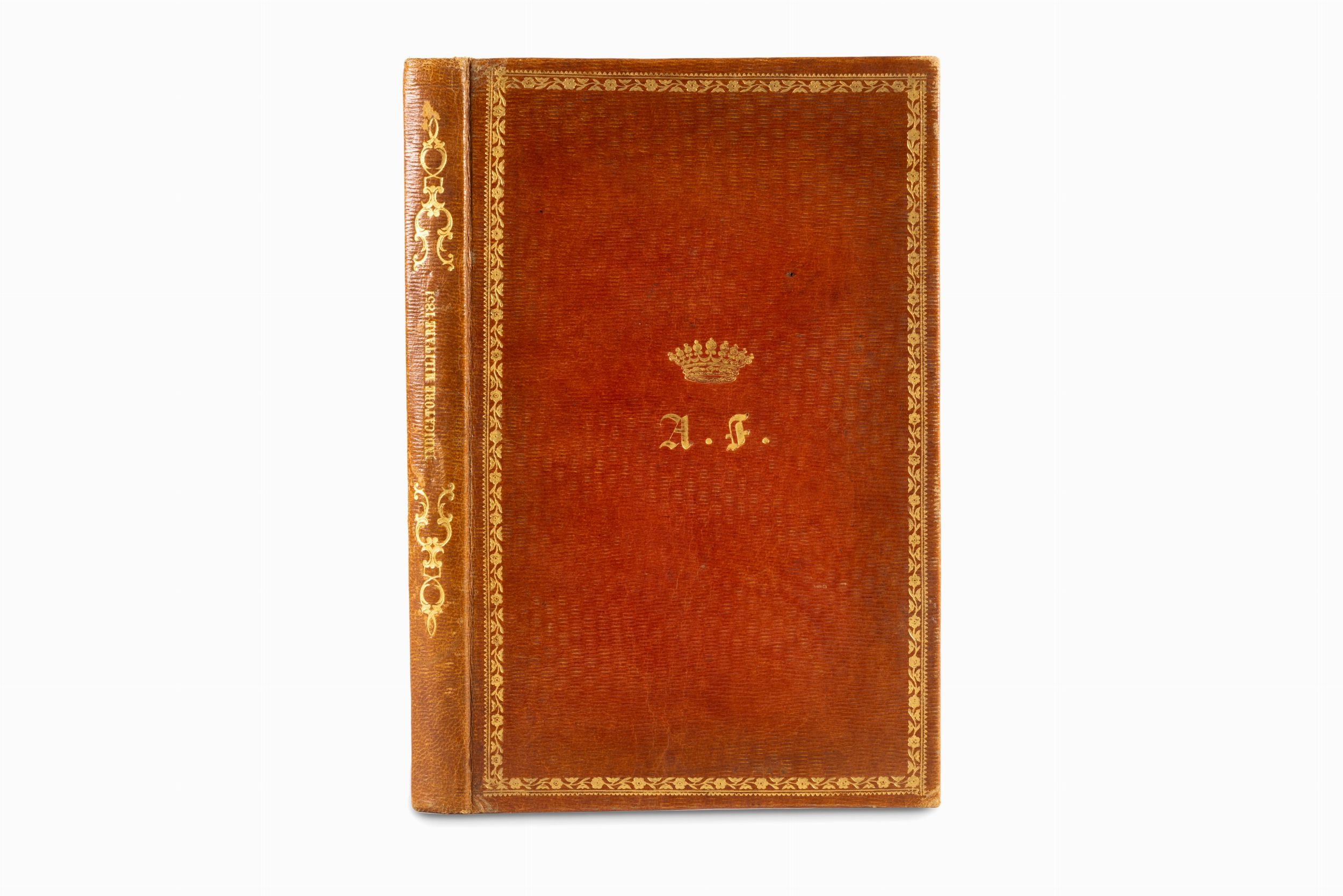 1851 Torino, presso la direzione della sentinella, piazza Vittorio Emanuele 9, 1851. In 8°. Al frontespizio le armi di casa Savoia, legatura in marocchino rosso, al piatto anteriore cornice di rotella floreale con al centro le iniziali A.F sormontate da corona, decorazione impressa in oro tagli gialli.