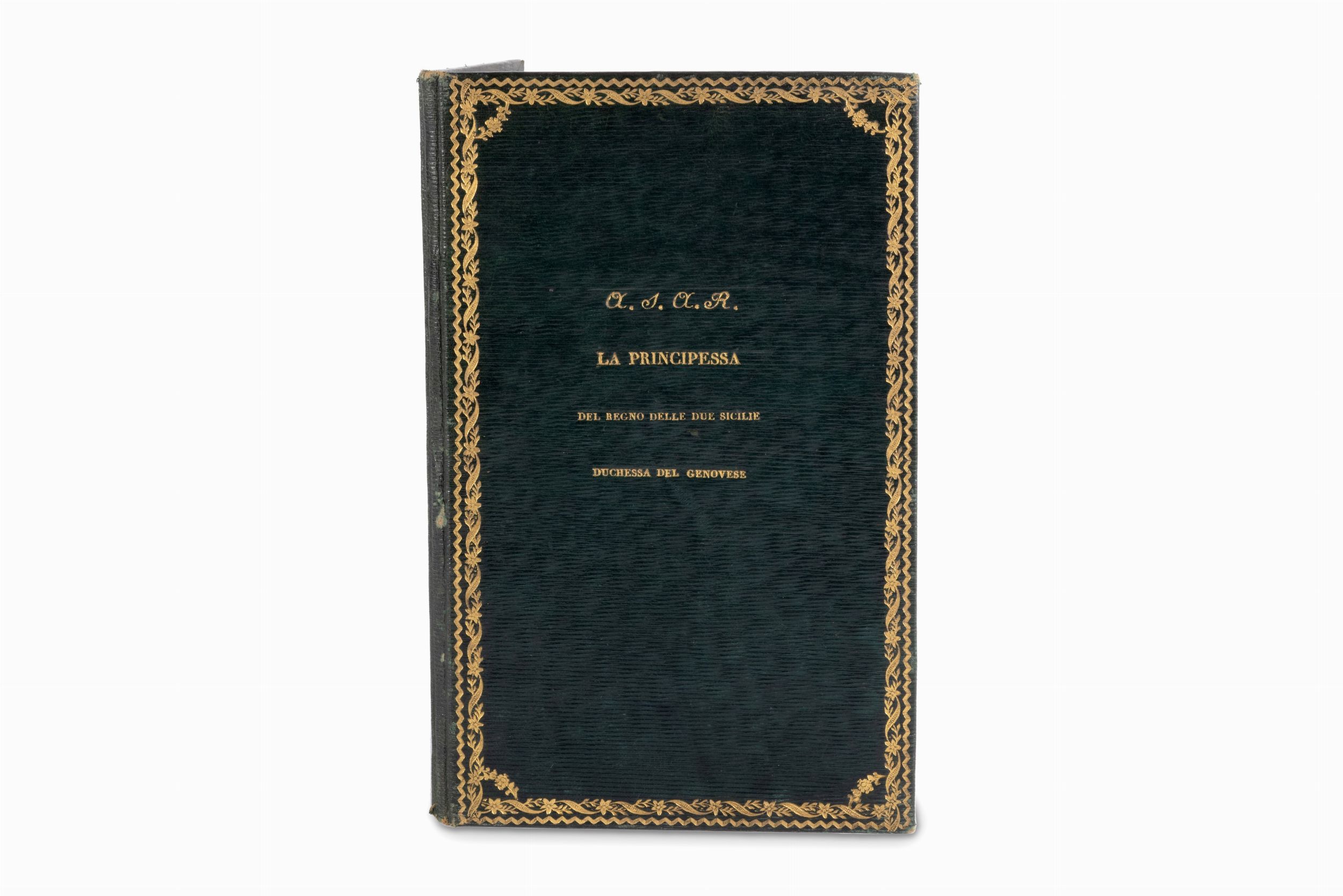 A.S.A.R/LA/ PRINCIPESSA/ del regno delle due Sicilie/ Duchessa del Genovese. Al contropiatto anteriore ex libris cartaceo sormontato da stemma Savoia, Biblioteca di S.A.R. IL PRINCIPE FERDINAND0 DI SAVOIA DUCA DI GENOVA.