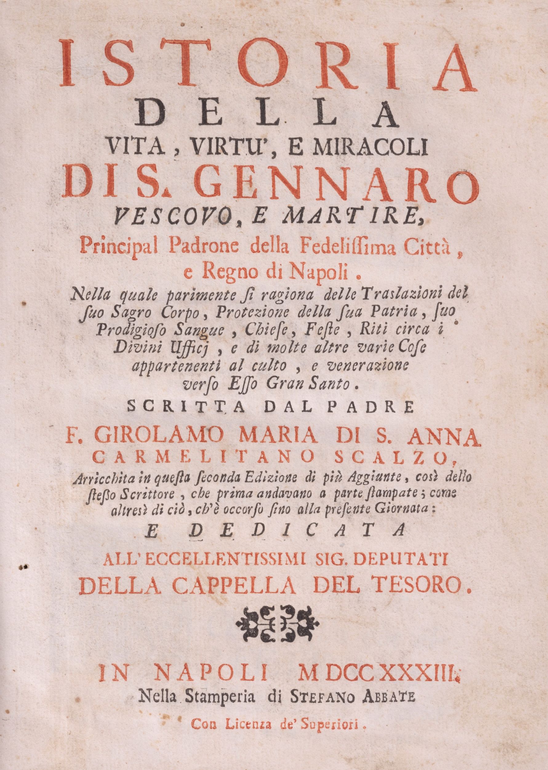 Napoli, nella Stamperia di Stefano Abbate, 1733. In 4°, artistica antiporta, raffigurante il busto del Santo circondato da figure allegoriche, incisa su rame da Antonio Baldi su disegno del Solimena, pp. (8)-516. Manca la tavola f.t. Legatura coeva in pergamena, titolo in oro al dorso.