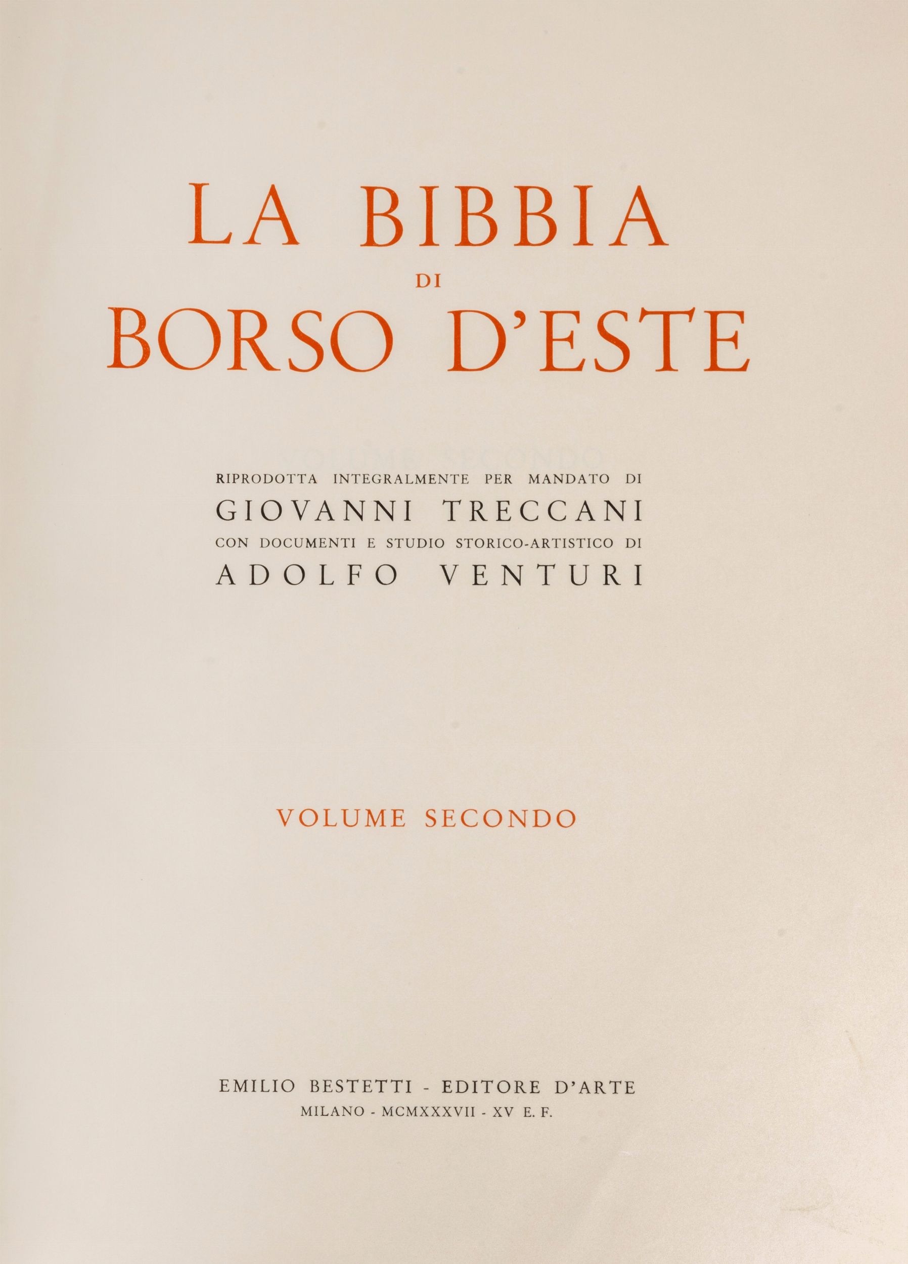 1937 Milano, Emilio Bestetti, 1937. In-folio, 68pp, 311 cc in b/n, 12 carte a colori, ritratto di Borso d’Este a colori a p.14; 292cc, 12 carte a colori.Legatura in pieno marocchino, con cornice in oro ai piatti, stemma di Borso d’Este in metallo al piatto anteriore di ciascun volume, aquile e gigli in oro al dorso, nervature, sguardie in raso marezzato rosso scuro con stemma di Borso d’Este in oro e rosette pure in oro. Completi di cofanetto in pelle.