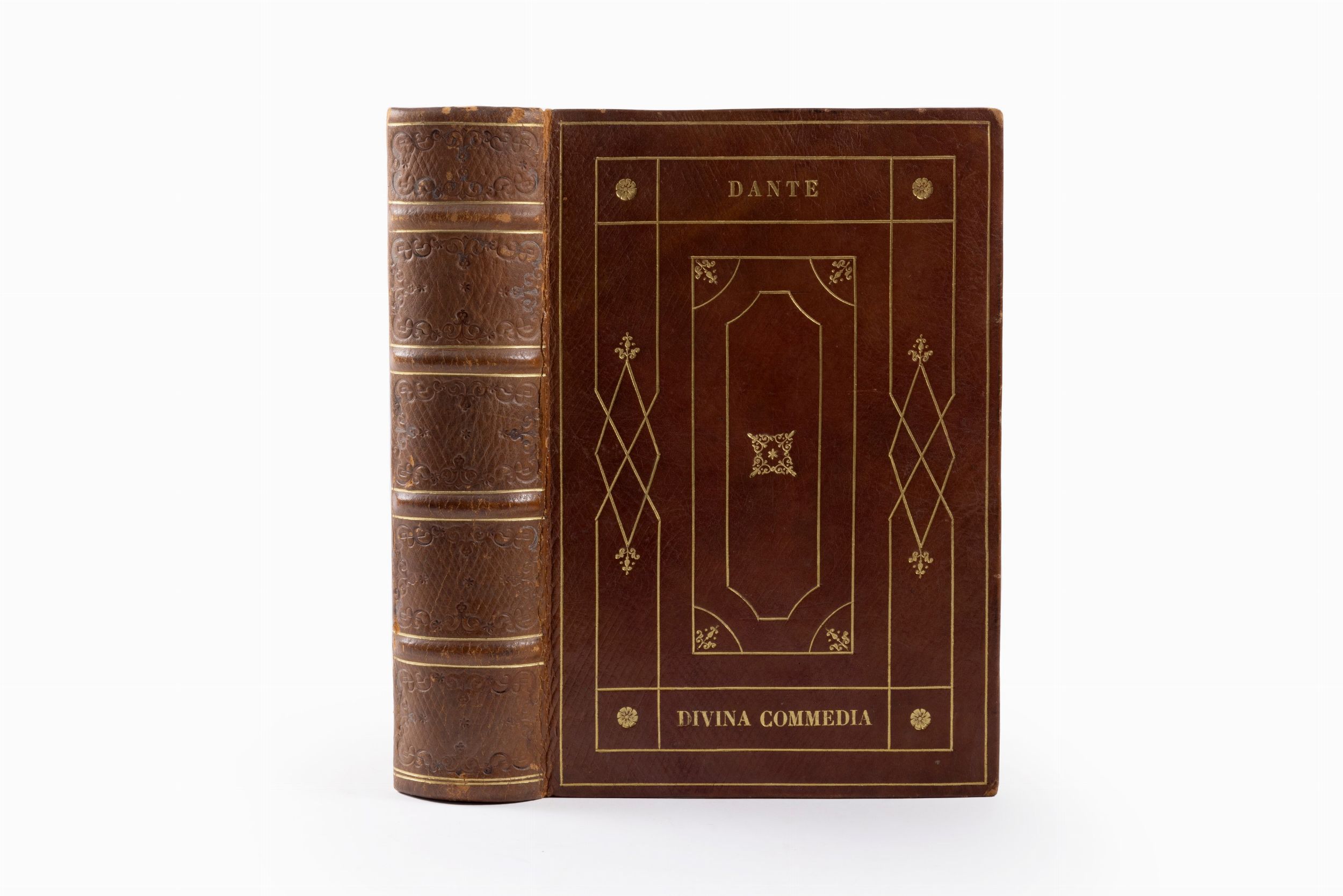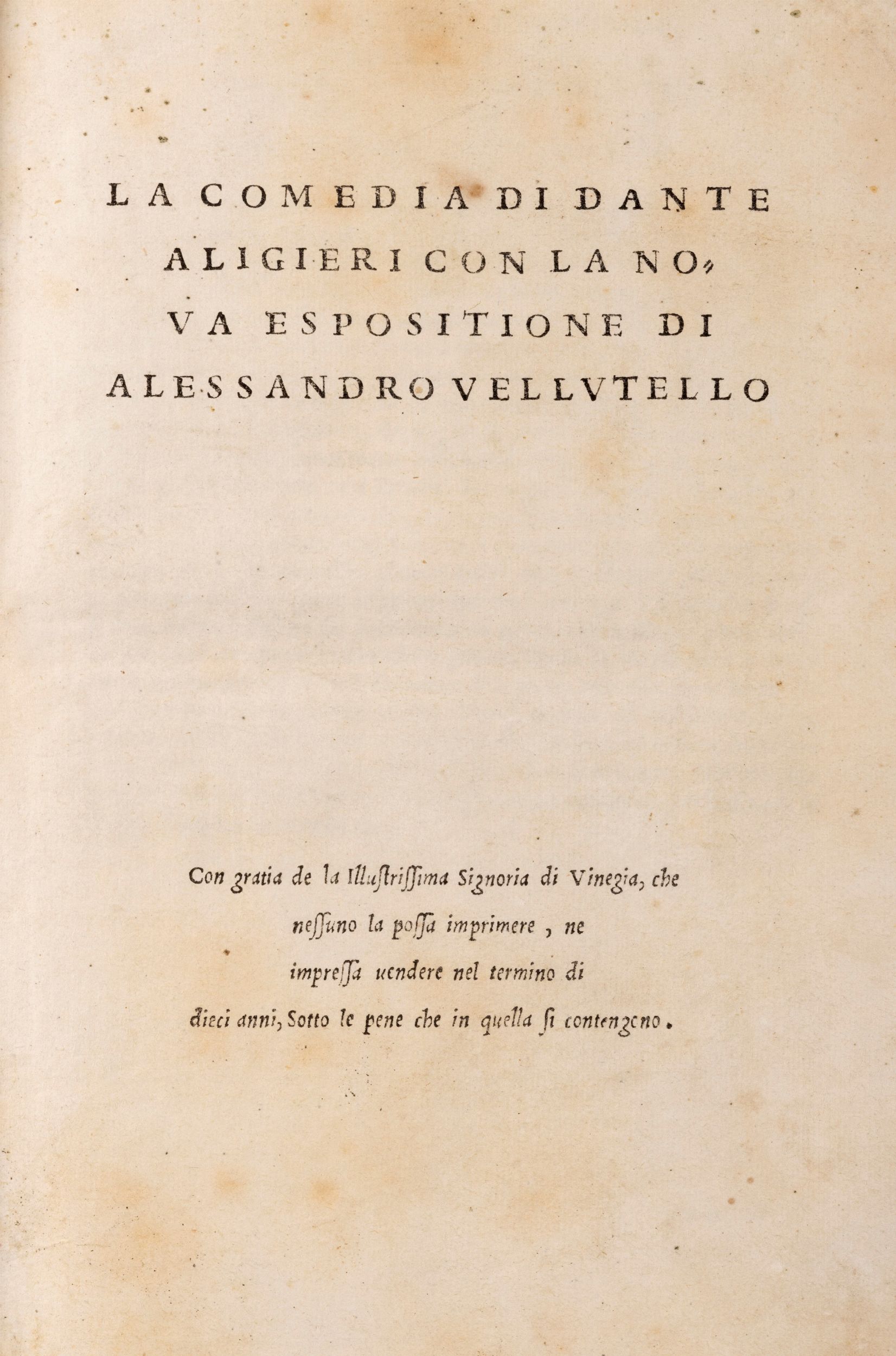 1544 Venezia, Francesco Marcolini ad instantia di Alessandro Vellutello, 1544. In 4°. Numerose illustrazioni incise in legno, testo inquadrato dal commento, glosse evanescenti, alcuni restauri, qualche leggera arrossatura e rarissime fioriture, più intense alle ultime carte, piccolo foro di tarlo al margine bianco superiore di AO5-AQ5, legatura del sec. XX in pelle con elegante decorazione in oro, dorso a 4 nervi con impressioni a secco e in oro, tagli blu, leggeri segni di usura ad angoli e cerniere.