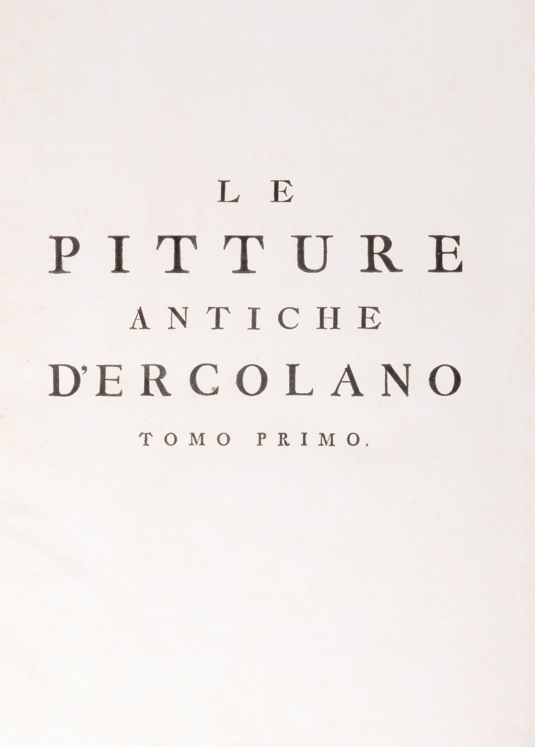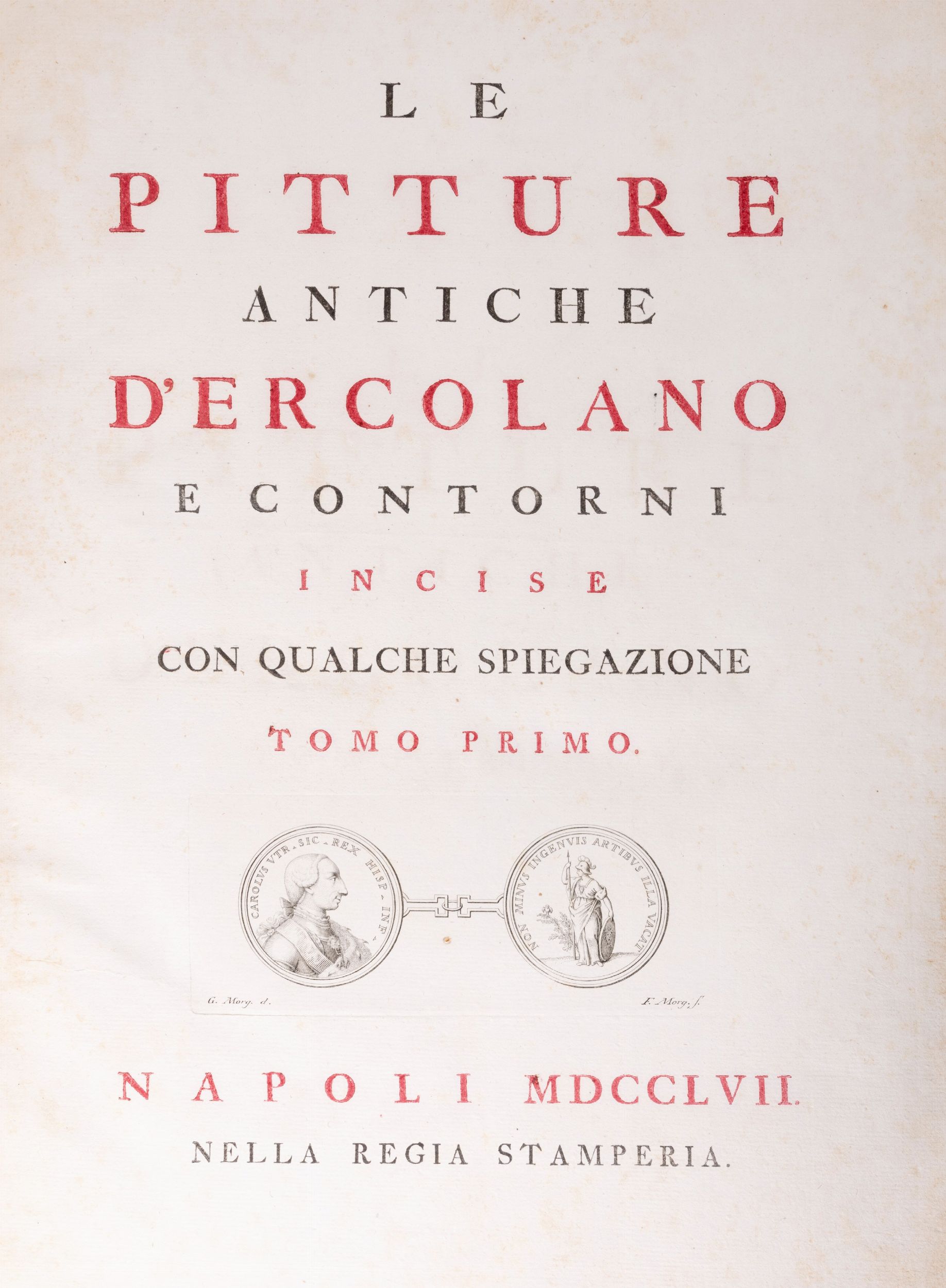 1757 Napoli, Regia Stamperia, 1757, 1760, 1765, 1767. In 2°. Esclusivamente i tomi I, II, IV e V. (Il V tomo è intitolato De' Bronzi di Ercolano e contorni [...]). Antiporta allegorica al I vol., frontespizi in rosso e nero, ritratti di Carlo III di Borbone, al I vol: 52 tavole; al II vol. 60 tavole; al IV vol. 70 tavole; al V vol. 84 tavole, capilettera figurati, vignette calcografiche, numerose illustrazioni nel testo, leggera brunitura, lievi fioriture, legatura coeva in pelle, piatti inquadrati da cornice e fregi in oro, tagli dorati, dorso decorato a 7 nervi, qualche graffio, lievi difetti ai dorsi, lievi segni d'usura agli angoli. Ex libris ai contropiatti.
