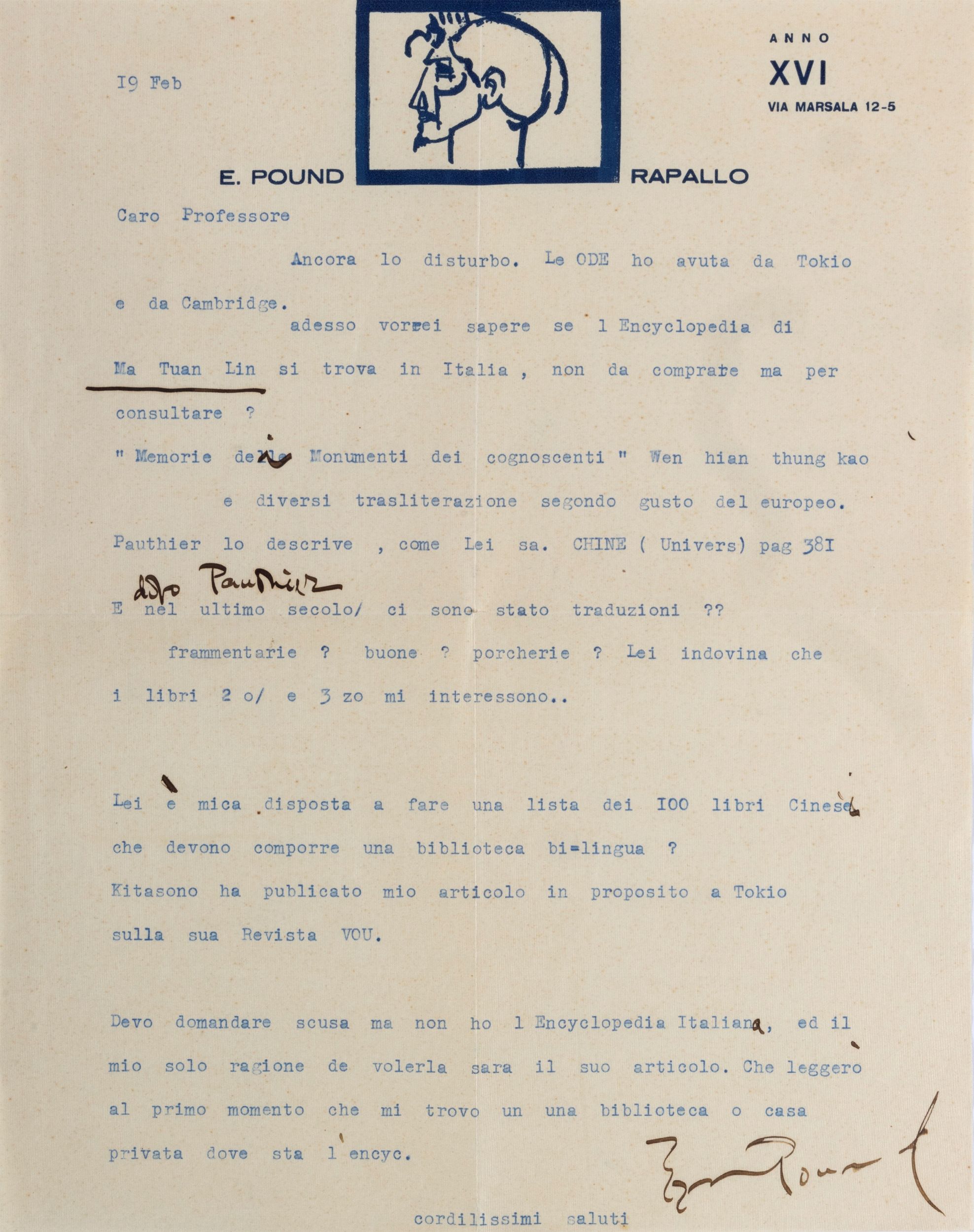 Ezra Pound, lettera dattiloscritta su carta intestata E.POUND RAPALLO con ritratto inciso, diverse correzioni a mano e firma autografa, datata 19 febbraio Anno XVI [1938], destinatario sconosciuto.