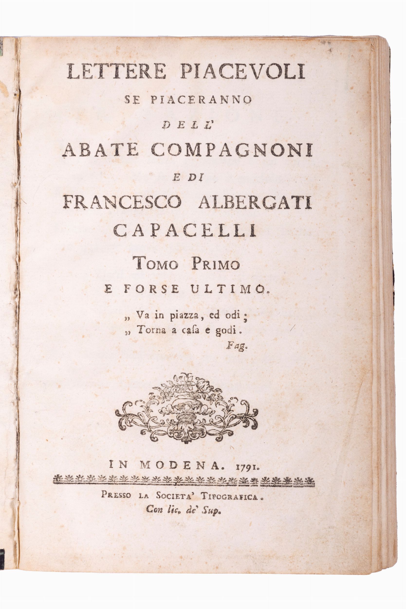 1791 Modena, Società Tipografica, 1791. In 8°. Fregio xilografico al frontespizio, qualche leggera brunitura, lievi fioriture, legatura in mezza pelle, lievi difetti.