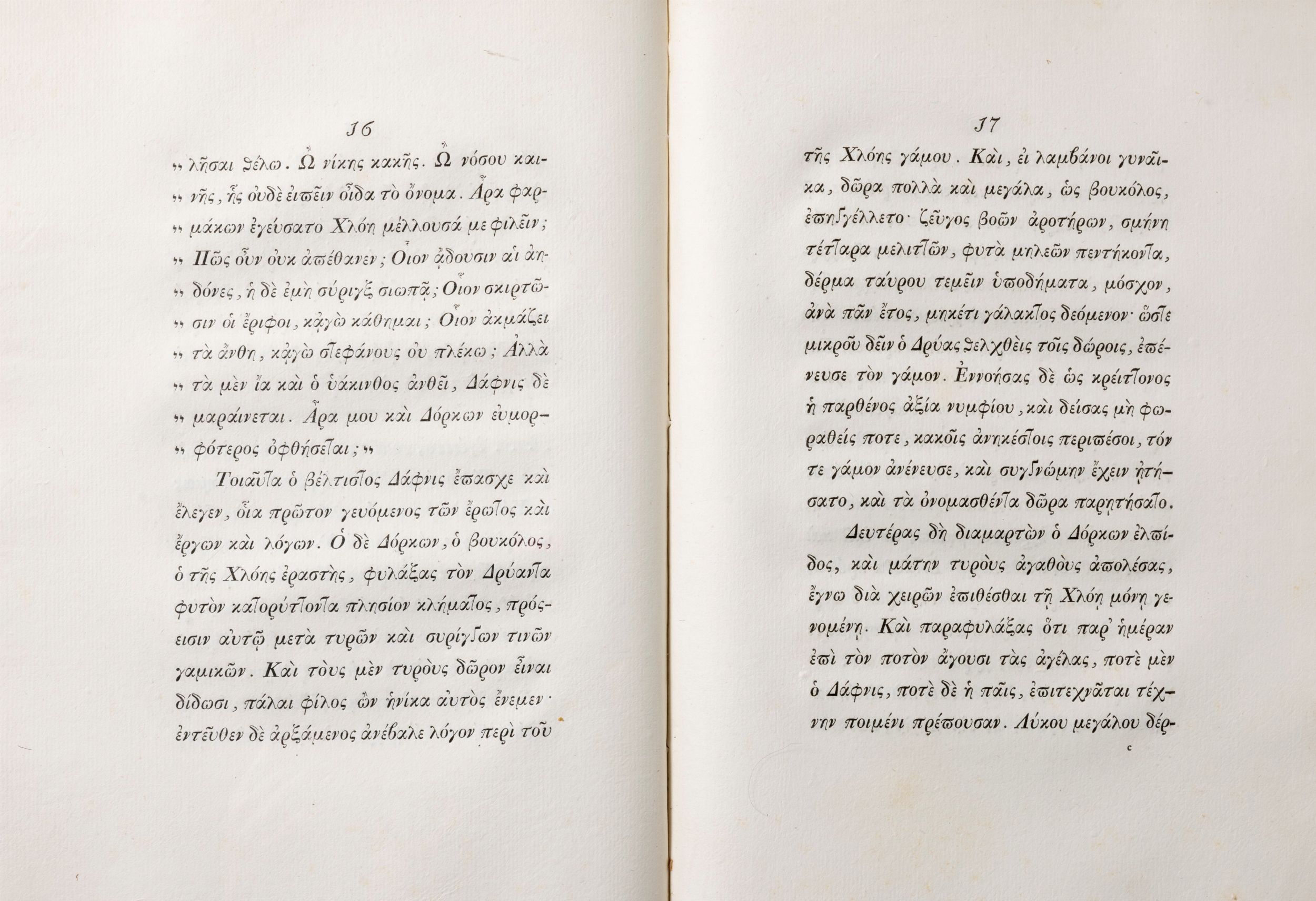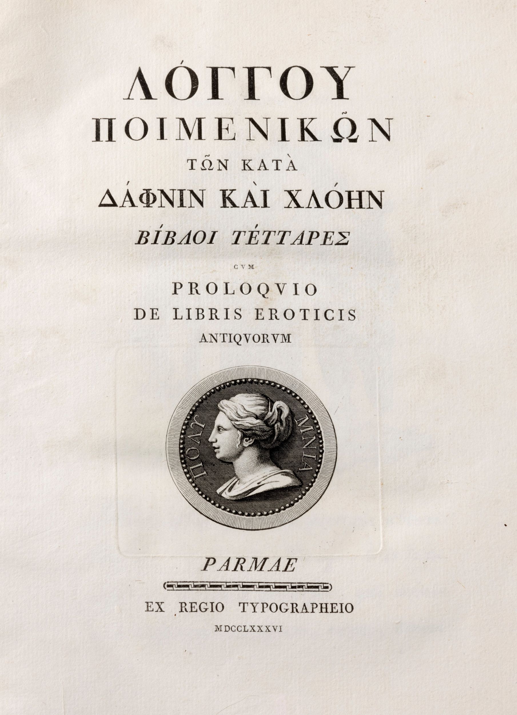 Parma, Giambattista Bodoni, 1786. In 2°. Vignetta calcografica al frontespizio e alla dedica, testo in greco, legatura coeva in mezza pelle e chagrin, titolo e autore impressi in oro al dorso, segni di usura, lievi difetti. Timbro moderno di appartenenza alla carta di guardia.