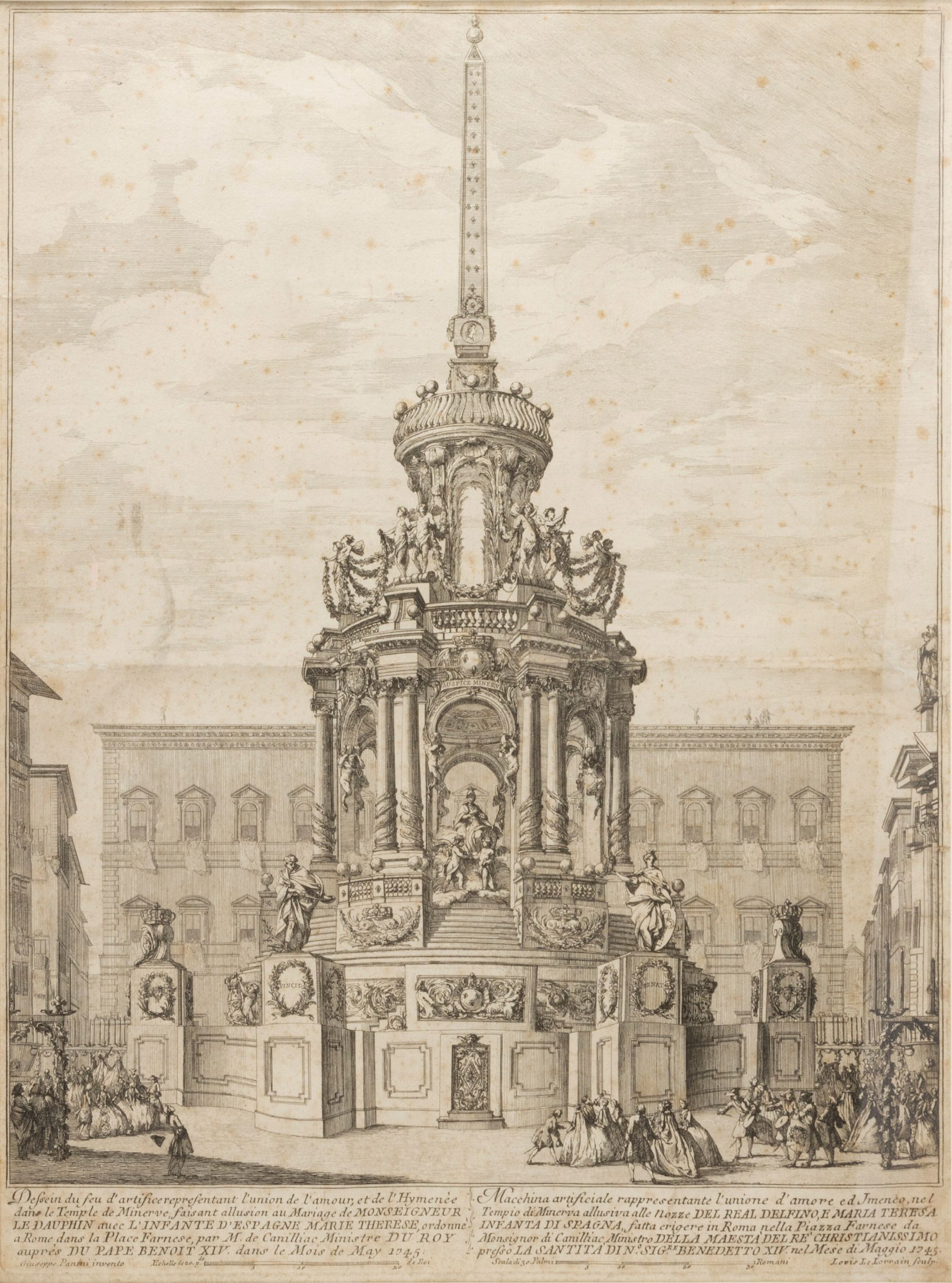 1745 Incisione eseguita al bulino e acquaforte, (Roma senza editore ), mm.670 x 520, in basso a sinistra firmato dal disegnatore ed a destra dall'incisore, testo in calce al foglio, titolo in italiano e francese, fioriture sparse, piegatura centrale , in cornice moderna in legno.