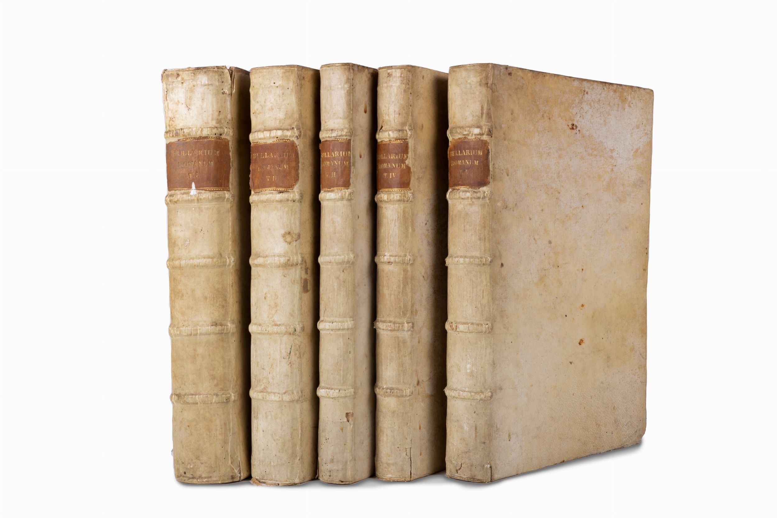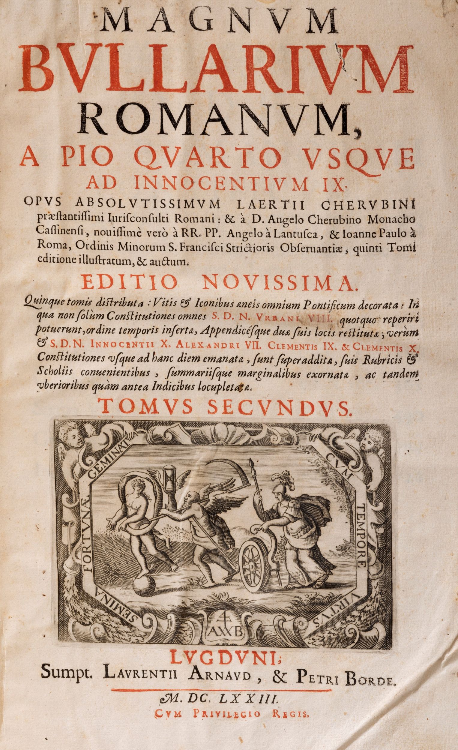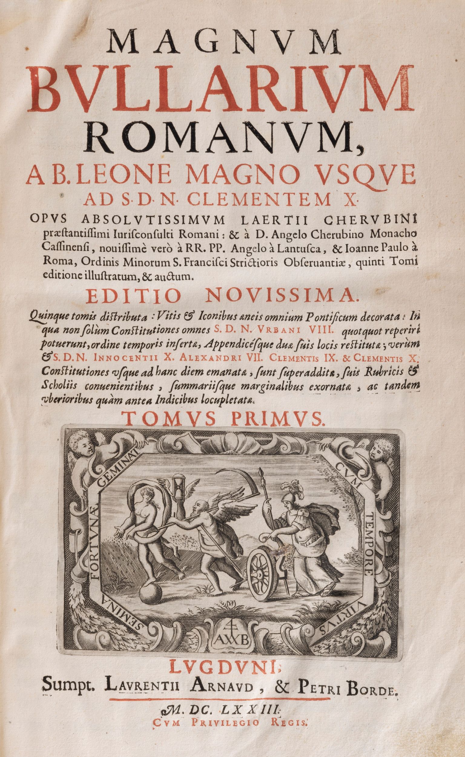 Lugduni, Sumpt. Laurentii Arnaud & Petri Borde, 1673. In Folio, voll. 5, artistica antiporta incisa su rame da L. Syivonx, grande marca tipografica incisa ai frontespizi, vignetta alla dedica raffigurante lo stemma dell'Arcivescovo Camillo de Neville sorretto da due putti, la vignetta si ripete al quinto volume, pp. (14)-832; (4)-728; (4)-451; (4)-308-(56)-126; (36)-570-(44) con 228 ritratti incisi su rame n.t. raffiguranti i ritratti dei Pontefici da Pietro a Clemente X. Legatura coeva in piena pergamena, titolo in oro al dorso.