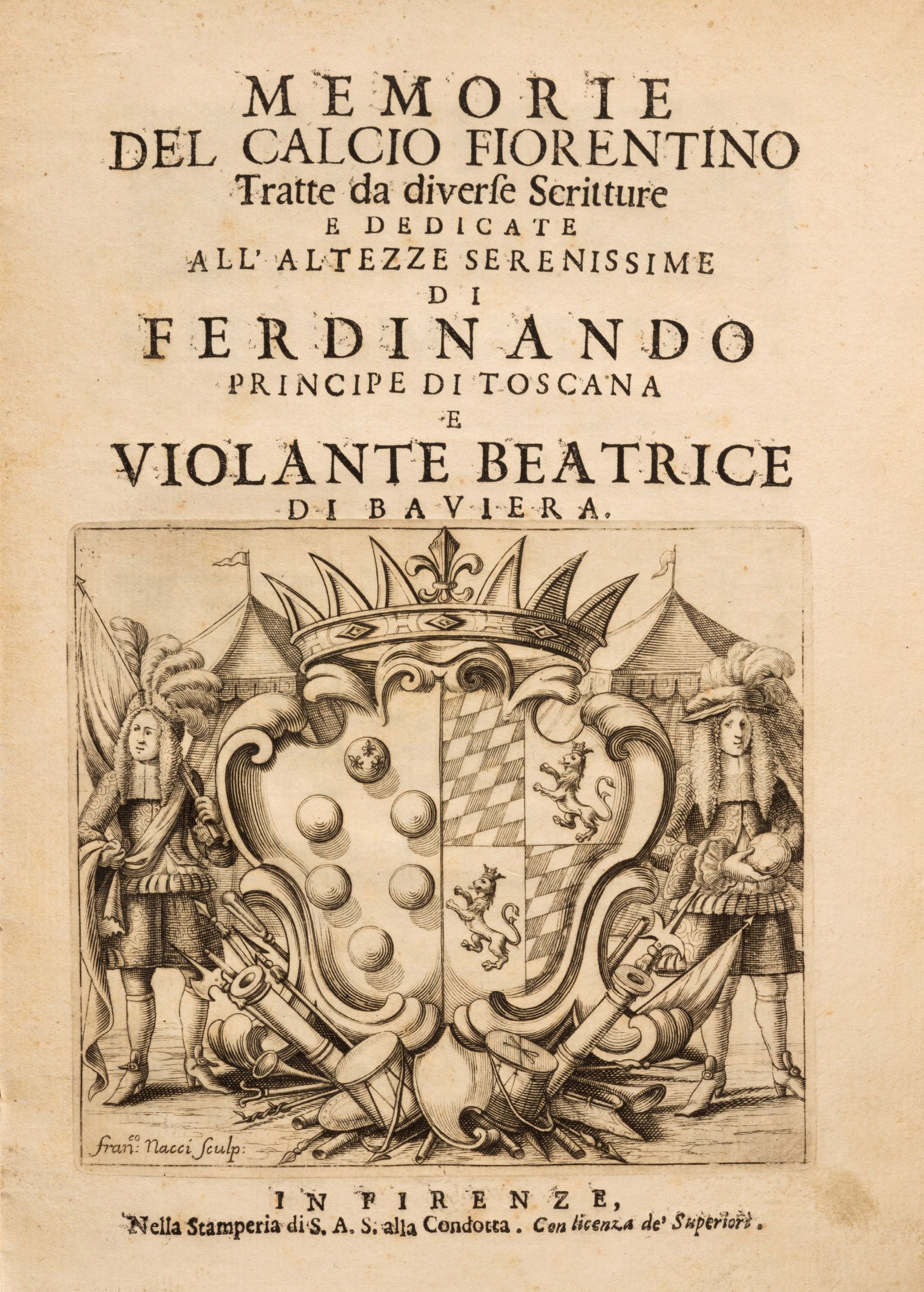 1688 Firenze, Stamperia di S.A.S. alla Condotta, 1688. In 4°, (6cc), 106pp.Occhietto, frontespizio con vignetta calcografica figurata con stemma dei Medici inciso da Francesco Nacci, iniziali e fregi xilografici, tavola calcografica con Veduta della Piazza di S. Croce disegnata da Alessandro Cecchini, tavola calcografica con la Pianta e ordinanza delle due squadre. Testo in italiano e greco. Legatura in cartonato coevo, titolo manoscritto al dorso.