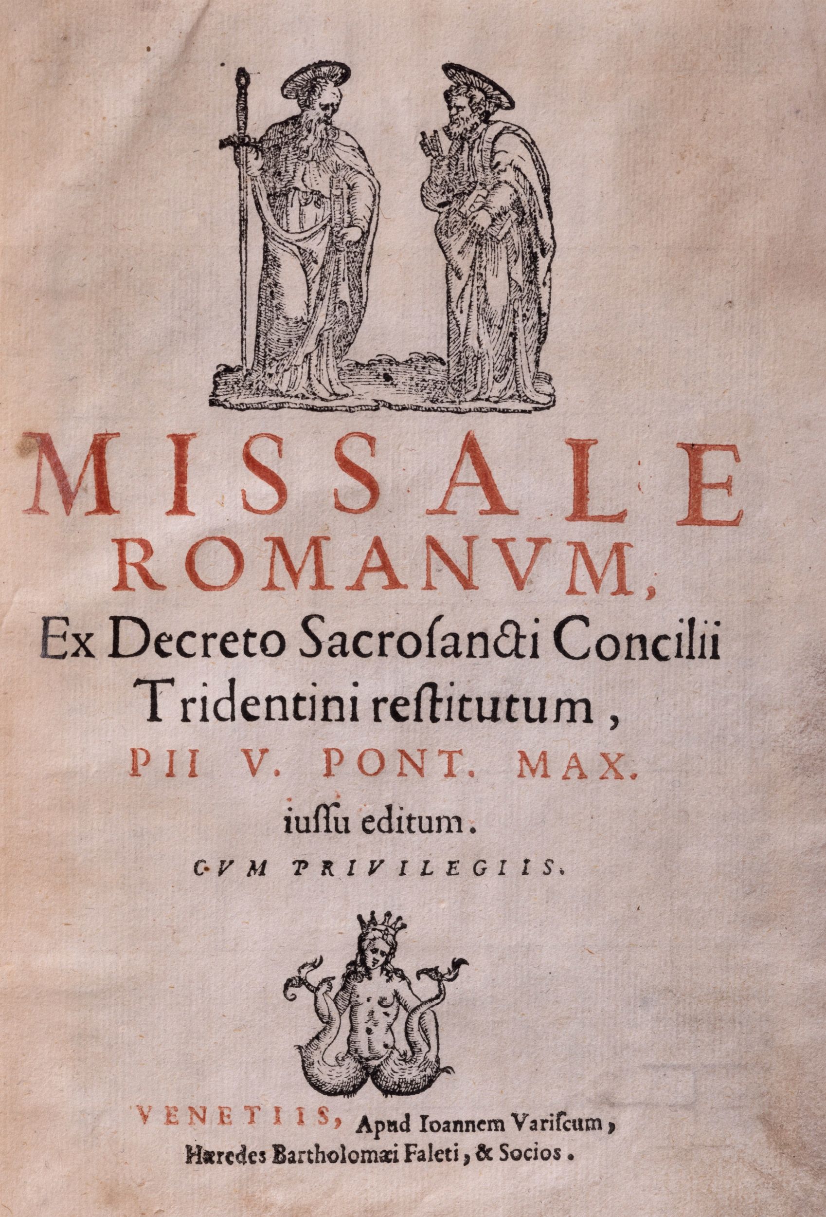 Venetiis, Aud Joannem Variscum, Haeredes Bertholomei Faleti, & Socio 1571. In 4°, frontespizio a stampa rosso e nera con vignetta incisa in legno, in alto, raffigurante l'allegoria del potere religioso e del potere temporale della Chiesa, in basso marca tipografica, 16 cc. nn.; pp. 534; una carta n.n. per il colophon, con una tavola incisa su rame, raffigurante la crocifissione, alla fine delle carte preliminari che si ripete alla pagina 240; numerose iniziali istoriate e figurate e pagine di musica notata con testi di canti sacri. Stampa rosso e nera con caratteri tipografici appositamente forgiati. Legatura moderna in piena pergamena.