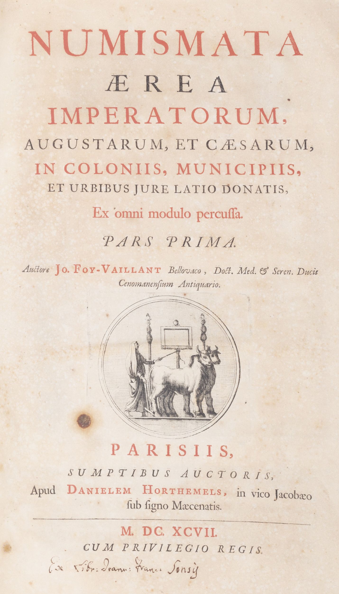 1697 Parigi, Daniel Horthemels, 1697. In 2°. 2 parti in uno ciascuna con proprio frontespizio. Vignetta calcografica al frontespizio stampato in rosso e nero, con una carta geografica ripiegata, numerose monete incise in rame nel testo, iniziali, testatine e fregi xilografici, leggera brunitura, lievi fioriture, piccola lacuna al margine esterno di *3, *4 allentata, carta 2F1 staccata, piccolo strappo senza perdita all'ultima carta, legatura coeva in mezza pergamena, autore e titolo impressi in oro entro tassello al dorso liscio, lievi difetti.