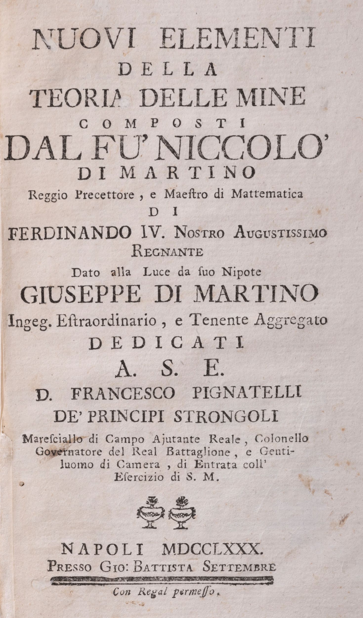 Napoli, presso Gio: Battista Settembre, 1780. In 8°, due opere legate insieme, precedute dal ritratto dell'autore inciso su rame da Michelangelo Vaccaro contenuto in Breve notizia della Vita di Niccolò di Martino raccolte dal Padre Maestro Francesco Saverio Granta, pp. 10-(2) + 16 + 36-(2); 33-(1) con due tavole di figure geometriche, ripiegate f.t, incise su rame da Michelangelo Vaccaro. Legatura coeva in piena pergamena, titolo in oro al dorso.