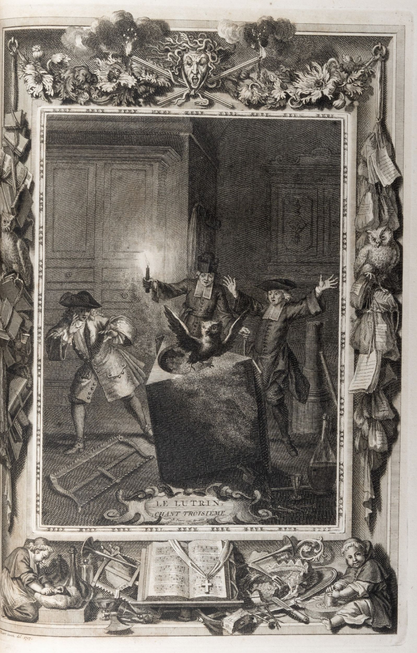 Amsterdam, David Mortier, 1718. In 2°. 2 tomi. entrambi i frontespizi stampati in caratteri in rosso e nero con vignetta con il ritratto di Erasmo, elegante antiporta allegorica figurata, ritratto a piena pagina dell'autore inciso da Drevet, ritratto della Principessa del Galles dedicataria dell’opera a piena pagina di Gunst dopo Kneller, testate, iniziali, finalini, testo inquadrato da cornice tipografica,6 incisioni a piena pagina ad apertura dei Canti di Le Lutrin, bruniture e fioriture, sparse, legature coeve in vitello marrone, decorazione impressa a secco, piatti inquadrati da cornice di greca ed elementi geografici stilizzati, dorso a 6 nervi, con ai comparti titolo in oro e fregi, piatto anteriore del primo volume staccato. Ex libris inciso del Conte Samminiatelli ai contropiatti.