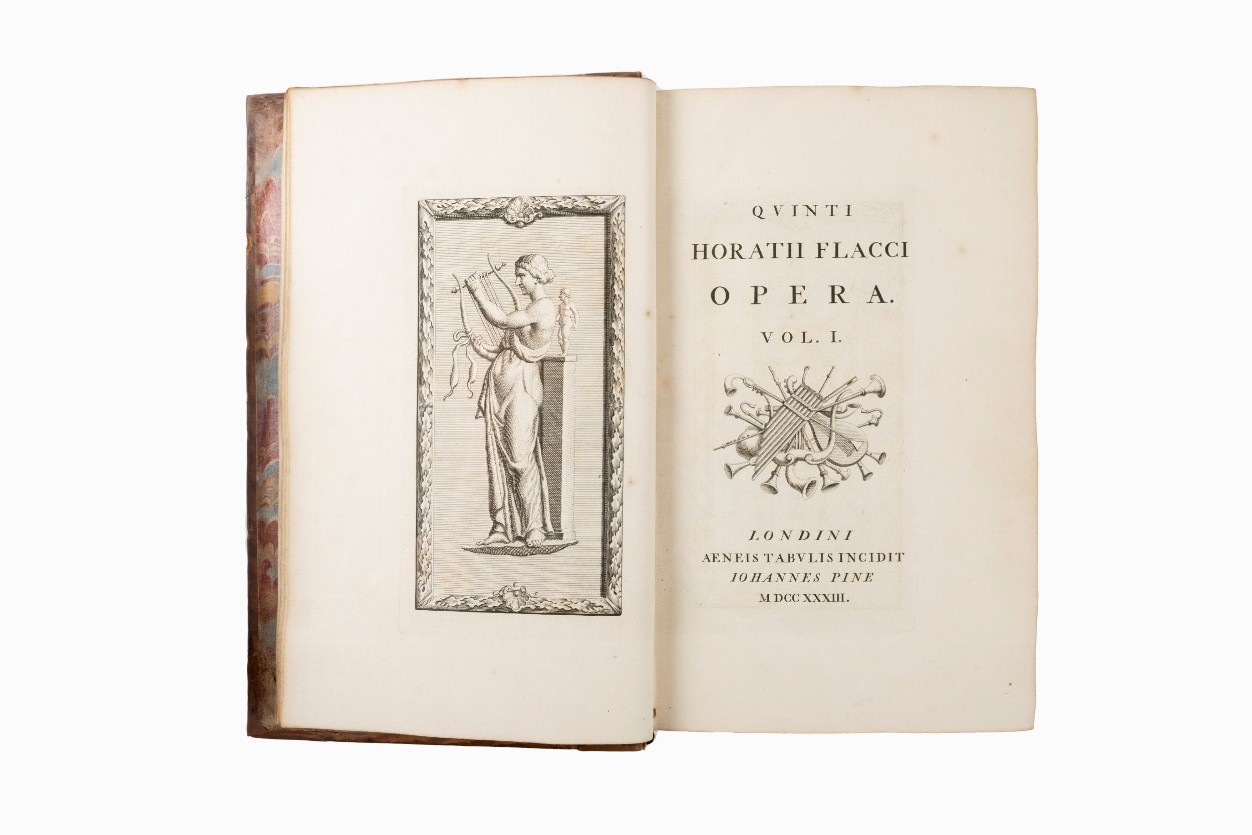1733 Londra, John Pine, 1733-37 (pubblicato nel 1737). In 4°. 2 voll. Antiporte figurate incise, illustrati completamente con testatine, capilettera, cul de lamps, e tavole nel testo finemente incise in rame raffiguranti monete, statue, medaglie, oggetti, anche il testo completamente inciso, qualche lieve fioritura, legatura coeva in vitello marmorizzato, piatti inquadrati da doppia cornice dorata, sguardie marmorizzate policrome, titolo e numero di tomo entro tasselli al dorso a 5 nervi, qualche spellatura, piccola fessura al dorso del II vol., lievi difetti. Firma di appartenenza alle carte di guardia datata 1884.
