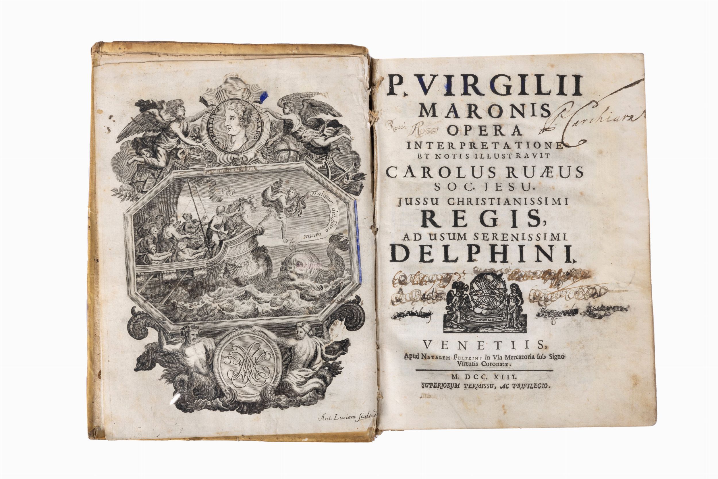 Venezia, Natale Feltrin, 1733. In 4°, due volumi legati in uno ciascuno con proprio frontespizio, artistica antiporta allegorica incisa su rame da Antonio Luciani, pp. (20)-238- (186); 624, legatura coeva in pergamena. Firme di appartenenza al frontespizio.