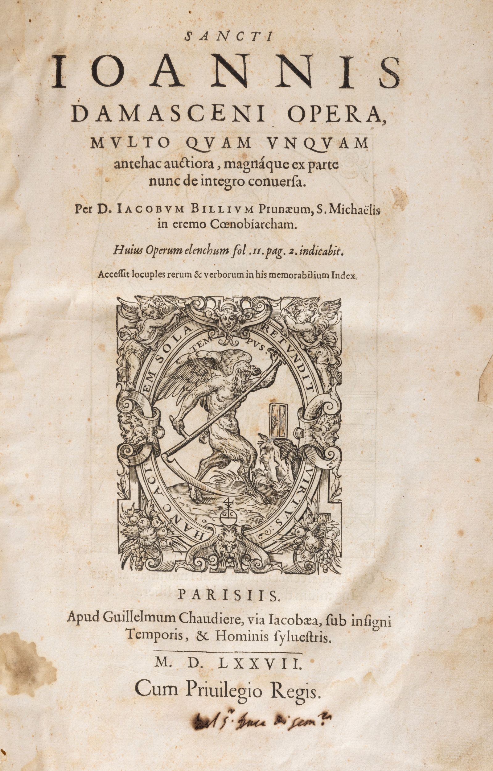 Parisiis, Apud Guillelmum Claudiere, 1577. In Folio, ritratto dell'Autore inciso su rame al verso del frontespizio, 615 cc. num.; 13 cc. nn. Legatura in piena pergamena, titolo in oro al dorso, tagli colorati.
