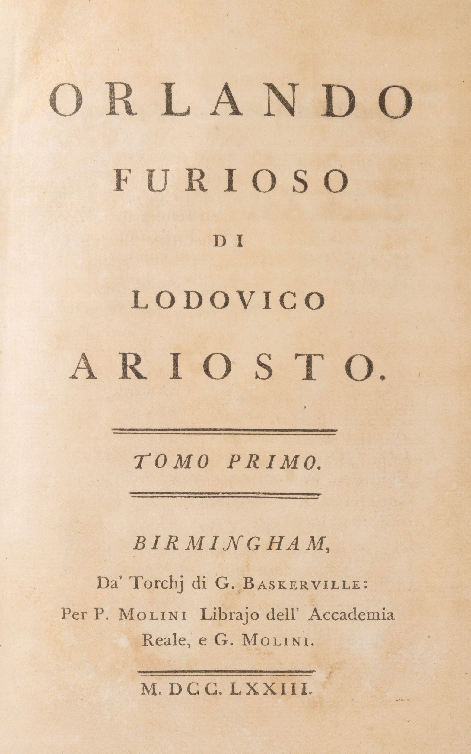 1773 Birmingham, G. Baskerville per P. Molini, 1773. In 8°. 4 voll. Antiporta con il ritratto dell'autore e 46 tavole incise da Cipriani, Cochin, Eisen, Greuze, Monnet e Moreau, consuete bruniture, legatura coeva in marocchino verde, con tripla cornice dorata ai piatti, dorso con decorazioni in oro e titolo su tassello rosso, tagli dorati, lievi difetti alle cuffie, qualche leggero graffio. Carta di guardia del I vol. manoscritta.